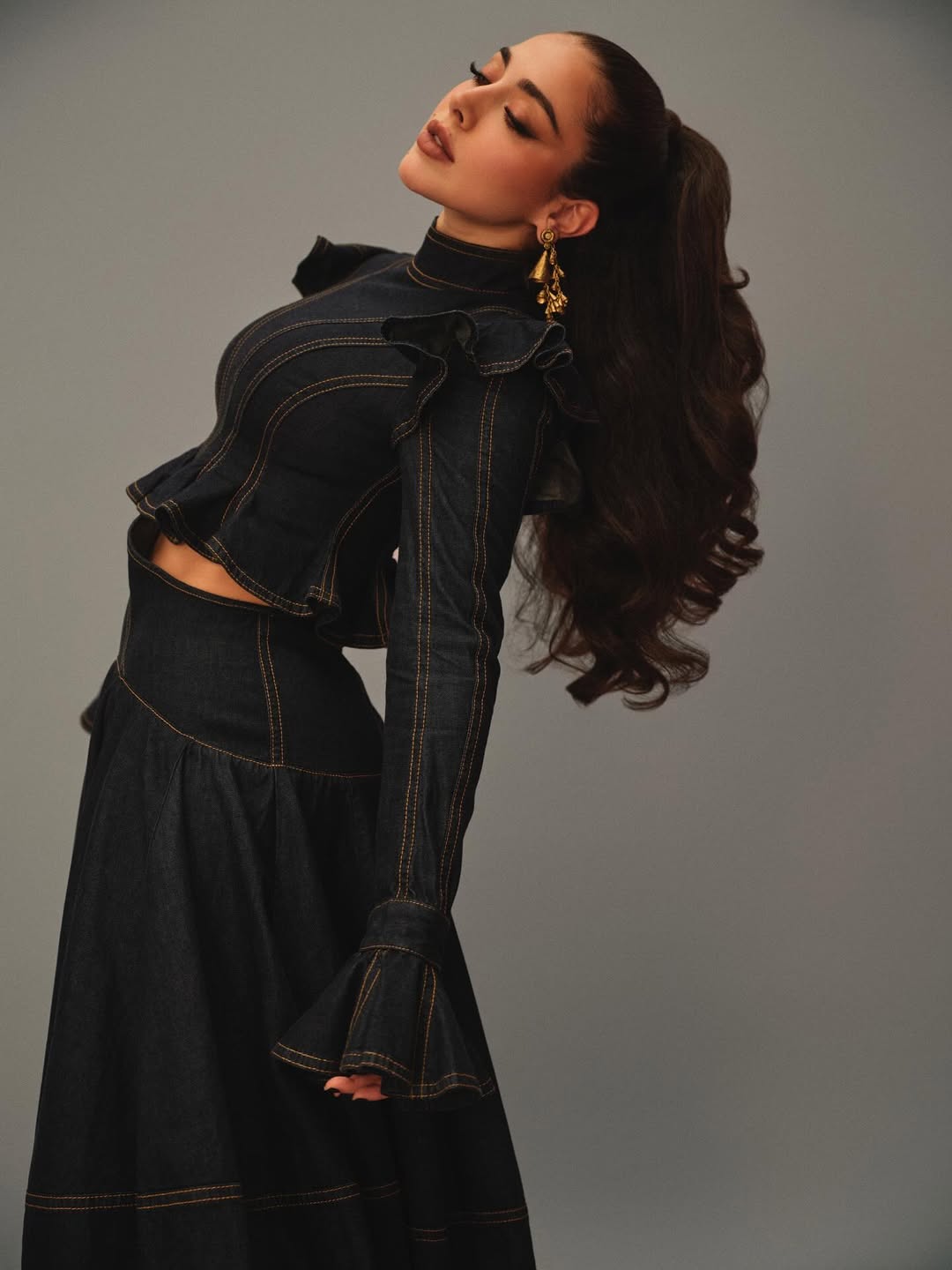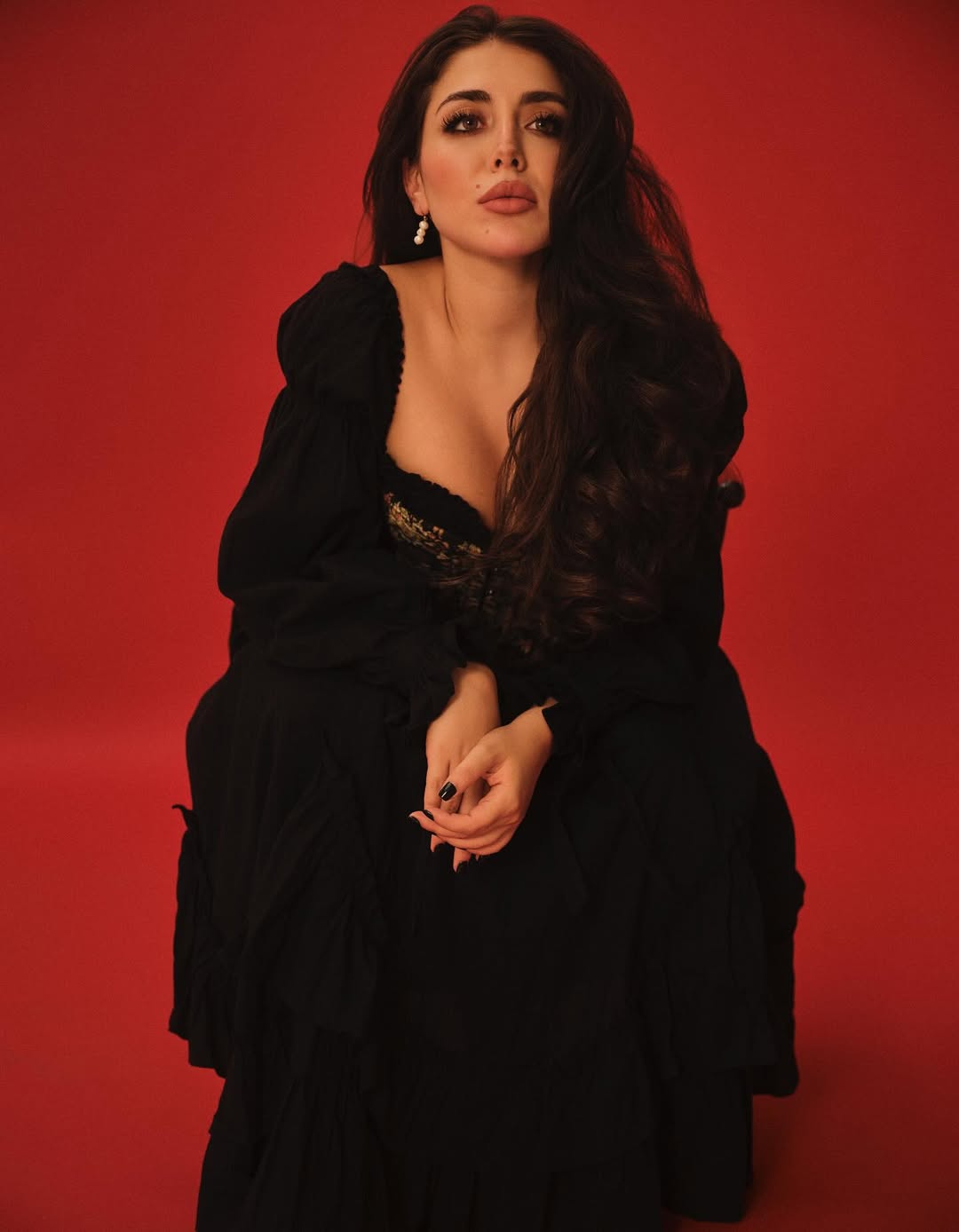 وفي جلسة تصوير سابقة، برز ميلها للستايل العصري عبر طقم دنيم داكن جمع بين تنورة ماكسي وتوب ضيق بقصّات كلوش، مع لمسات بنية بارزة وأقراط ذهبية طويلة، في إطلالة تمزج الجرأة بالحرفية. أما الستايل الكلاسيكي المعاصر، فظهر بوضوح في فستانها الأسود القصير الذي كسرته بلمسات برغندية عصرية، من الجوارب إلى الحقيبة، في توليفة تؤكد حسّها العالي بالتنسيق.