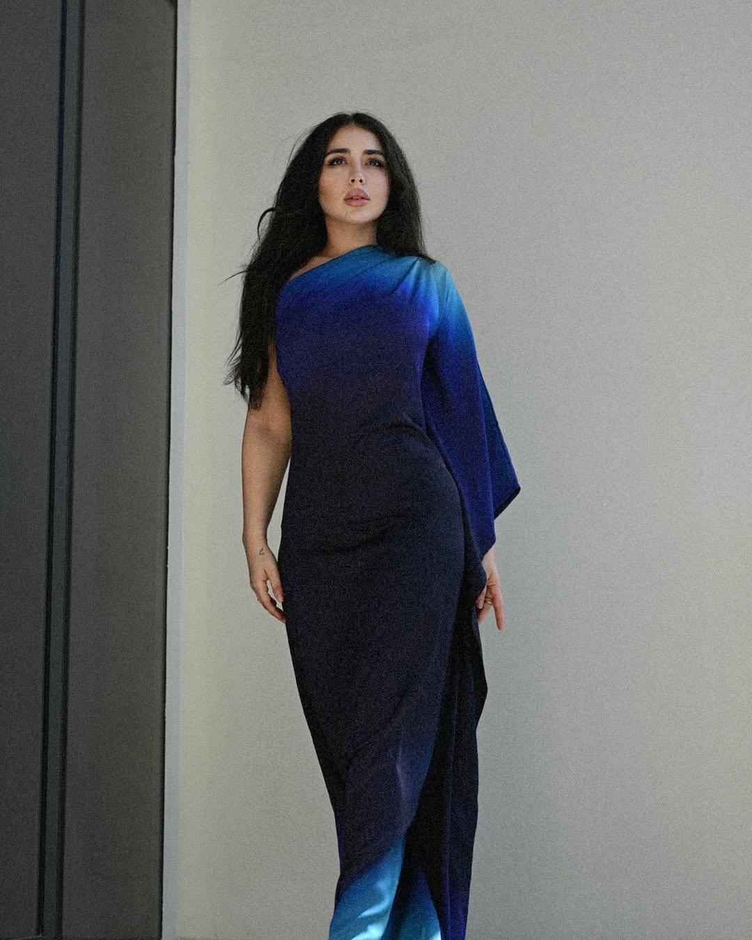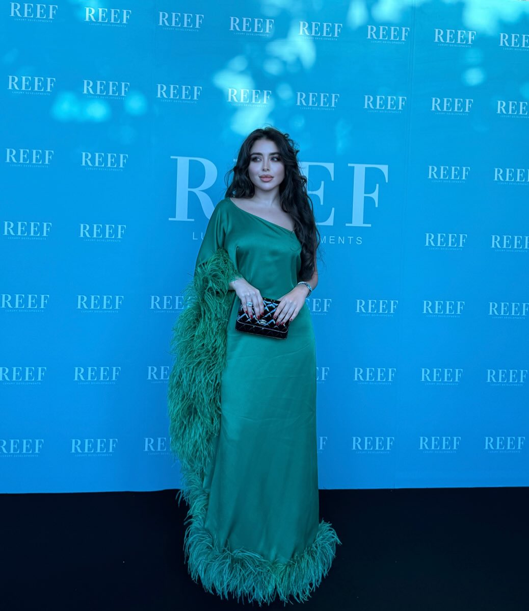 وفي السهرات، تميل إلى التصاميم التي تجمع بين الجرأة والرقي؛ فساتين كورسيه باللونين الأبيض والأسود، تصاميم بكتف مائل بتدرجات الأزرق، أو فساتين زمردية مزدانة بالريش، جميعها تعكس ذوقًا ناضجًا يعرف متى يلفت الانتباه ومتى ينسحب بهدوء. حتى في الفساتين القصيرة الحريرية، تحافظ هيا على لمسة أنثوية ناعمة بلا تصنّع.