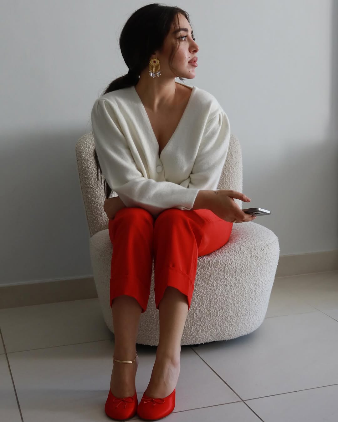 هيا لا تتردد أيضًا في التجريب، من الأبيض والأسود بطابع أنيق وذكوري–أنثوي، إلى البنطال الأحمر الناري مع القميص الأبيض الأوفر سايز، حيث بدا اللوك بسيطًا في فكرته لكنه قوي في حضوره.
