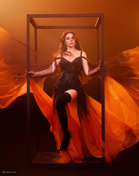 الفستان من توقيع طوني ورد، بتنسيق سيدريك حدّاد، جاء كتعبير بصري عن الانتقال من الغموض إلى القوة. تدرّج الألوان من الأسود المطرّز بالكريستال إلى البرتقالي الناري جسّد رحلة من الصمت إلى الانفجار، ومن السكون إلى الحضور الطاغي.