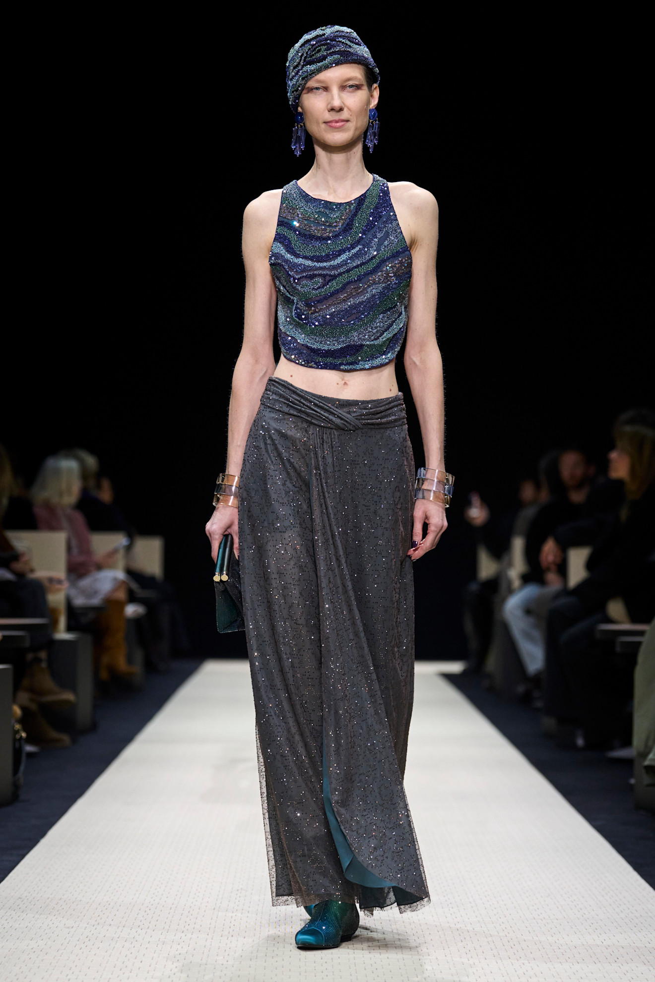 التنانير البراقة مع حبيبات الكريستال: بدرجات رمادية وفضية، تمنح إطلالة لافتة ومريحة، من دار Giorgio Armani.