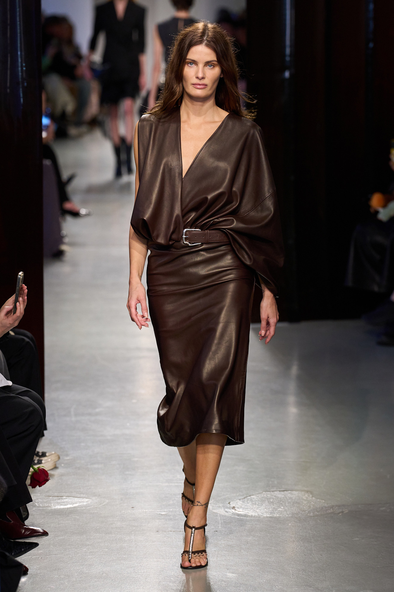 تنانير البني والساتان: مستقيمة ومريحة، تبرز الجاذبية مع توب جلدية أو هندسية، من دار Christopher Esber.