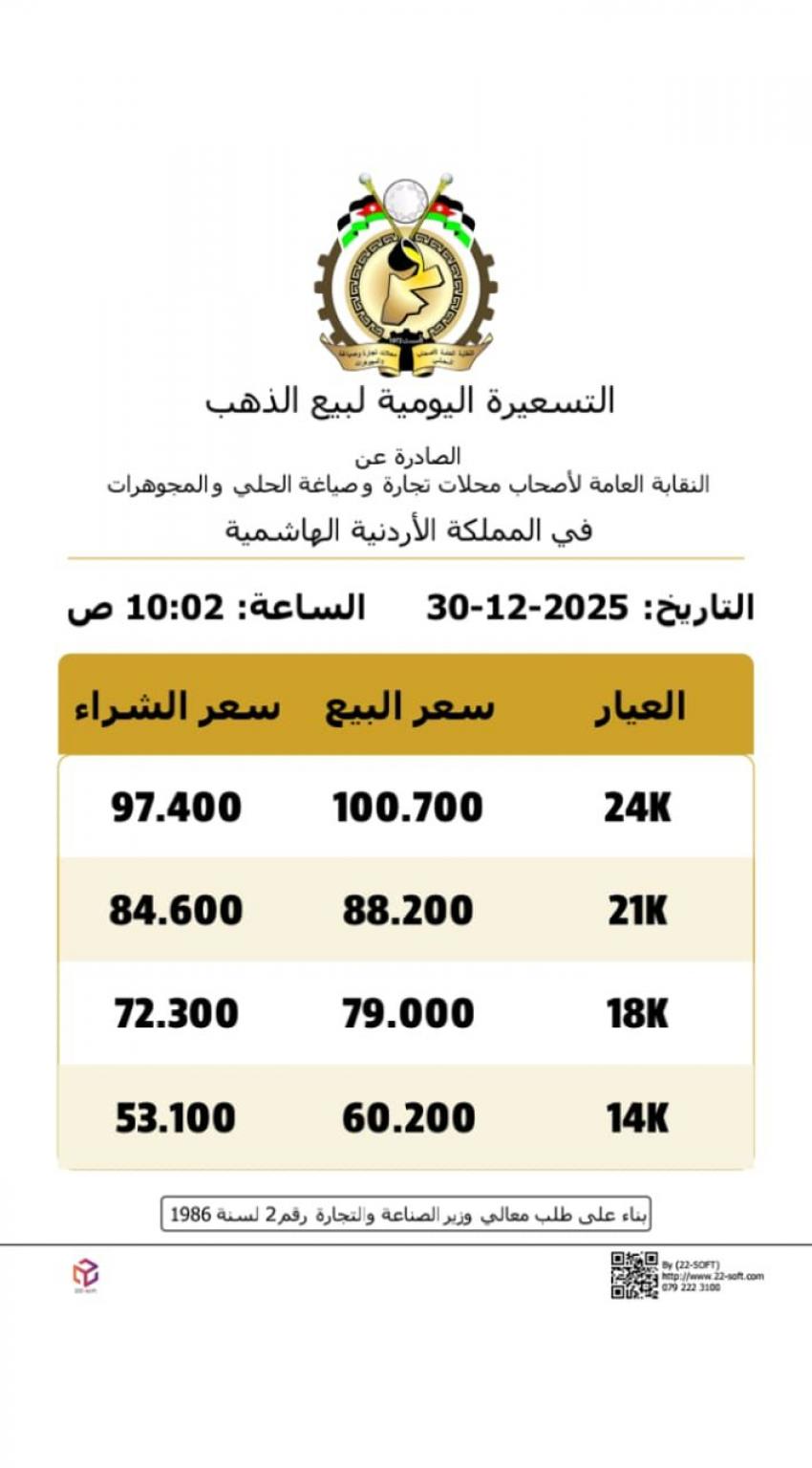 وحسب النشرة الصباحية التي أصدرتها النقابة العامة لأصحاب محلات تجارة وصياغة الحلي والمجوهرات، بلغ سعر الغرام الواحد من الذهب عيارات 24 و18 و 14 لغايات البيع من محلات الصاغة عند 100.70 و 79 و 60.20 دينارا على التوالي.