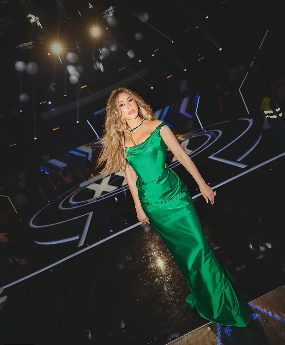 أما مايا دياب، فاختارت طريق الجرأة بإطلالة ميتاليكية خضراء خلال حفلتها في تركيا. تألقت بجمبسوت ضيّق باللون الأخضر العشبي، نسّقته مع كاب حريري لامع واسع ومنسدل، أضفى بعدًا دراميًا وفخمًا على الإطلالة. هذا اللوك أكد أن اللون الأخضر، بتدرجاته المختلفة من النعناعي إلى الزمردي، بات خيارًا أساسيًا لسهرات الموسم.
