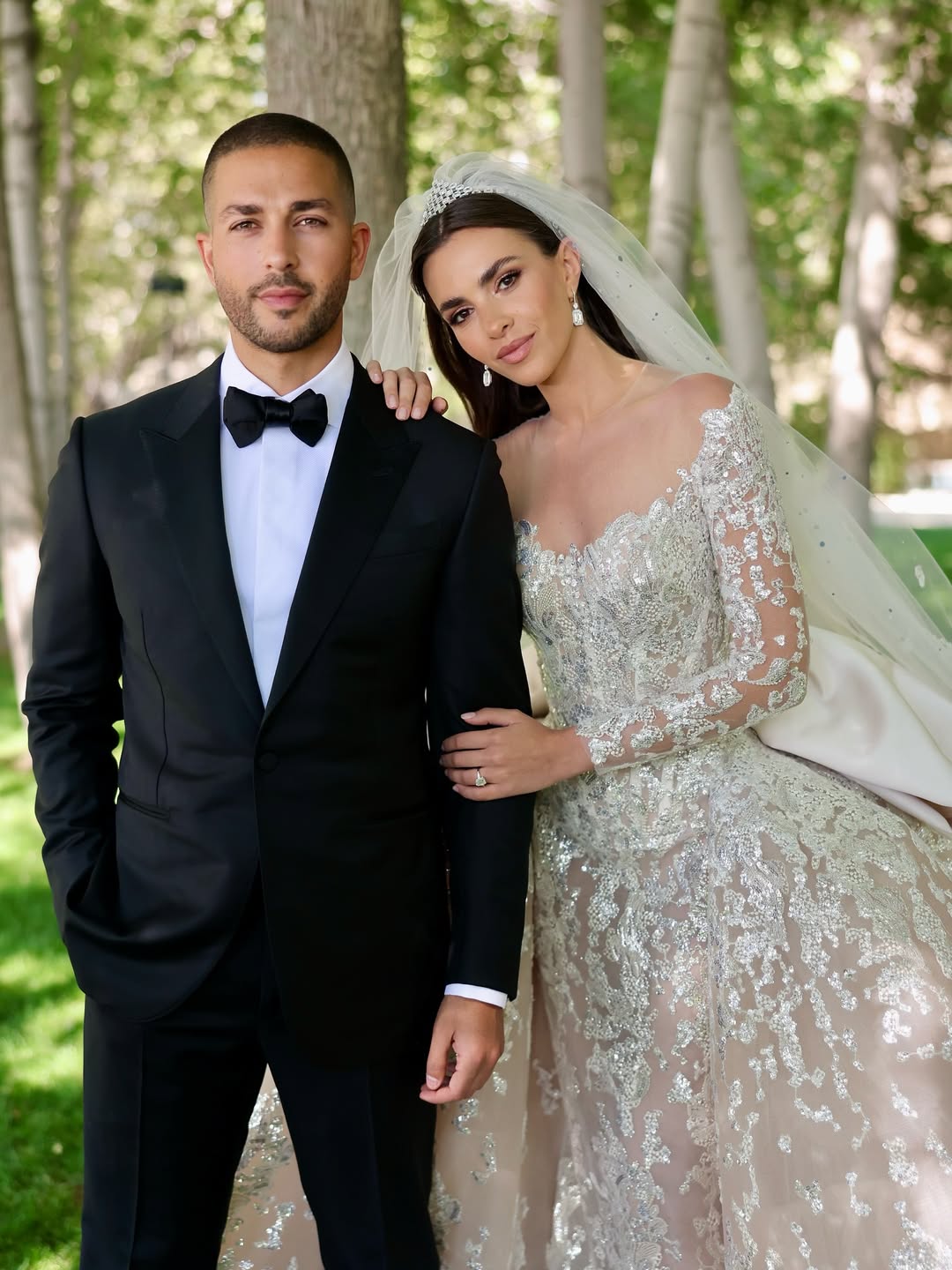 بلغت أناقة زين ذروتها في يوم زفافها، حيث أطلت بفستان ملكي من تصميم إيلي صعب بقصة أوف شولدر، وأكمام طويلة غنية بتطريزات الترتر. عانق الفستان قوامها بكورسيه مطرز، وانسدل بذيل منتفخ مزين بفيونكة حريرية كبيرة، مع طرحة طويلة وتاج مرصع. اكتفت زين بأقراط ماسية وخاتم زفافها، لتترك للفستان مهمة خطف الأنظار… وقد نجح بامتياز.