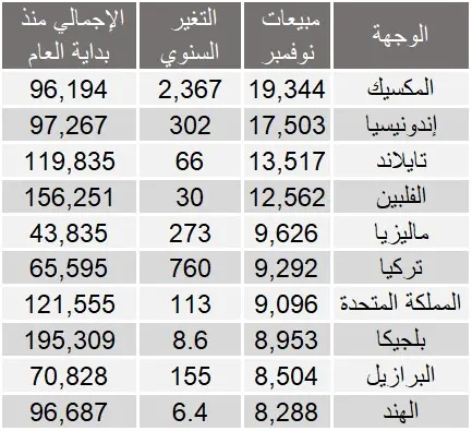 أهم 10 وجهات تصدير (حسب عدد السيارات الكهربائية):