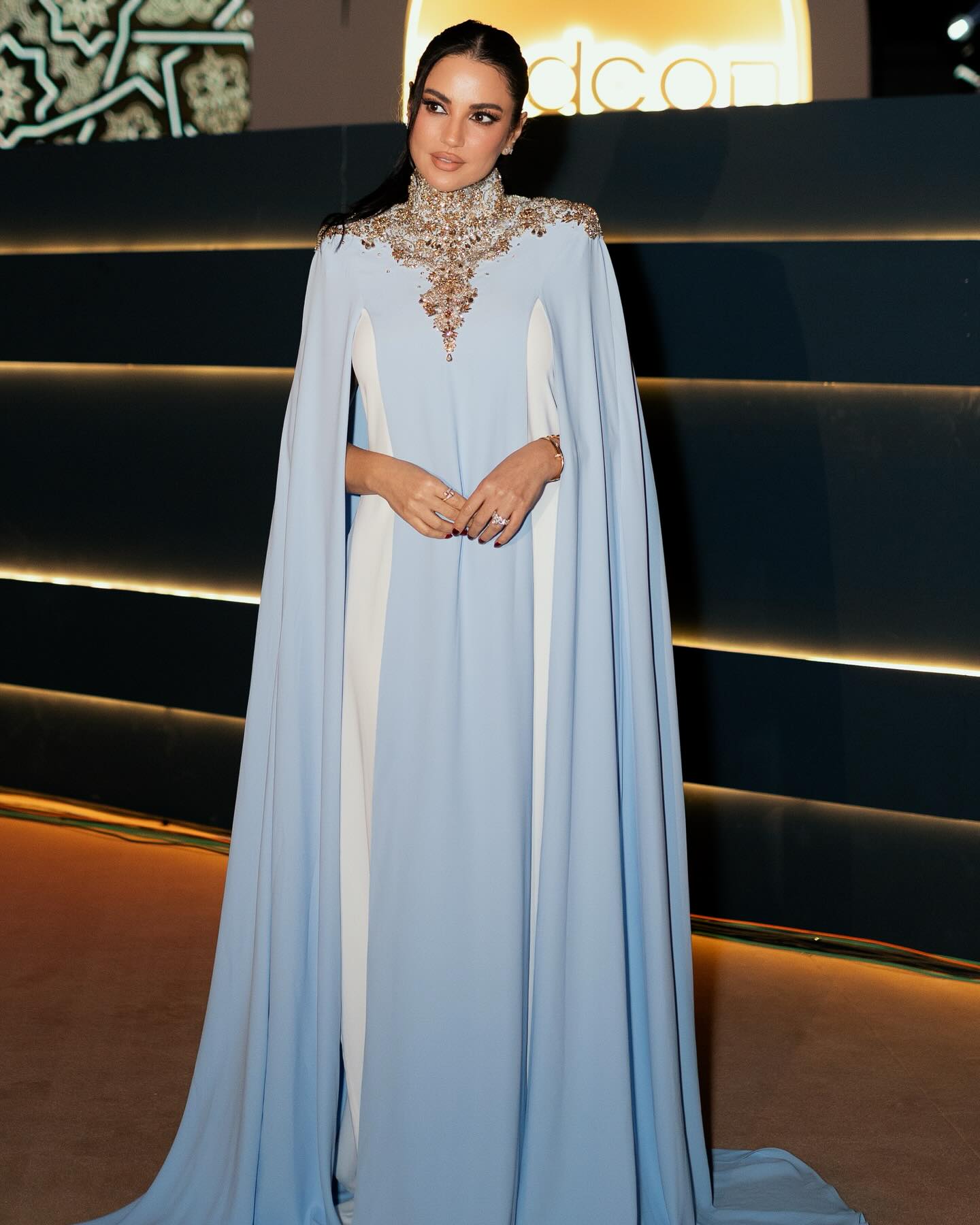 النجمة التونسية درة كانت من أبرز من تبنّين هذا الأسلوب، حيث تألقت بإطلالة بيضاء طويلة ومريحة من توقيع Khaled & Marwan، أضاف لها الكاب الأزرق السماوي لمسة فنية راقية، خاصة مع الأكتاف المزينة بالتطريزات الذهبية. وفي ظهور آخر، اختارت فستانًا أخضر داكنًا مع عباءة مخملية شفافة من Maison Lola، جمعت فيها بين الدفء والفخامة بأسلوب متوازن.
