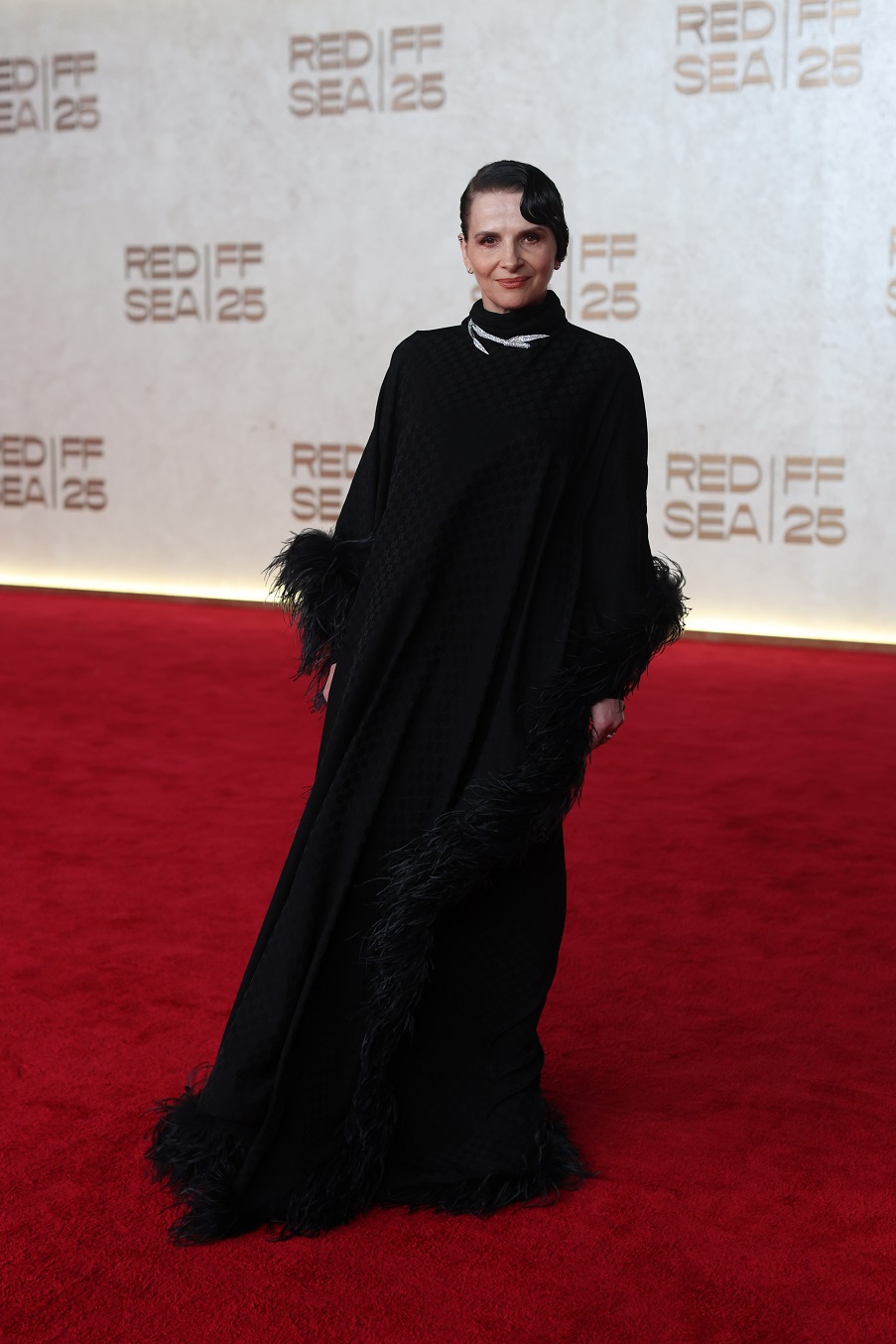 وعلى السجادة الحمراء لمهرجان البحر الأحمر، تألقت جولييت بينوش بفستان أسود فضفاض من Gucci، مزين بالريش على الحواف، مع أكمام خفاش وياقة عالية. الإطلالة عكست أناقة محتشمة بطابع فني، اكتملت بعقد مرصع وتسريحة شعر مبللة زادت من رقي الحضور.