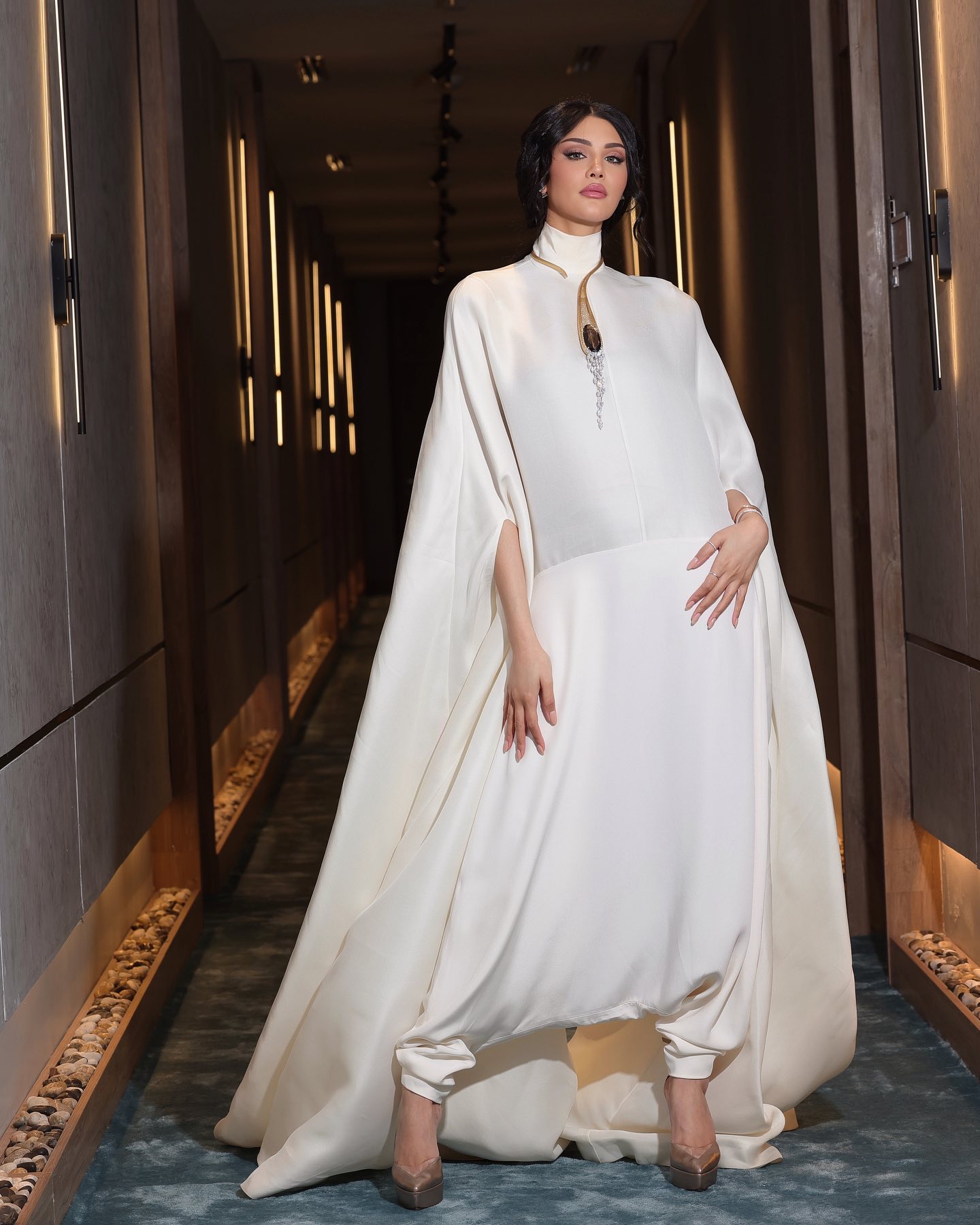 بدورها، خطفت أميمة طالب الأنظار بفستان أبيض فضفاض أشبه بالعباية، تميز بياقة مرتفعة وأكمام منسدلة كوشاح، مع تصميم مبتكر مغلق من الأسفل يوحي بسروال واسع، ما منح الإطلالة طابعًا عصريًا غير تقليدي، عززته بعقد ذهبي جريء.