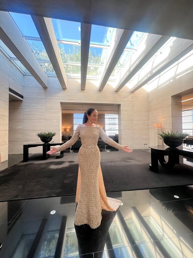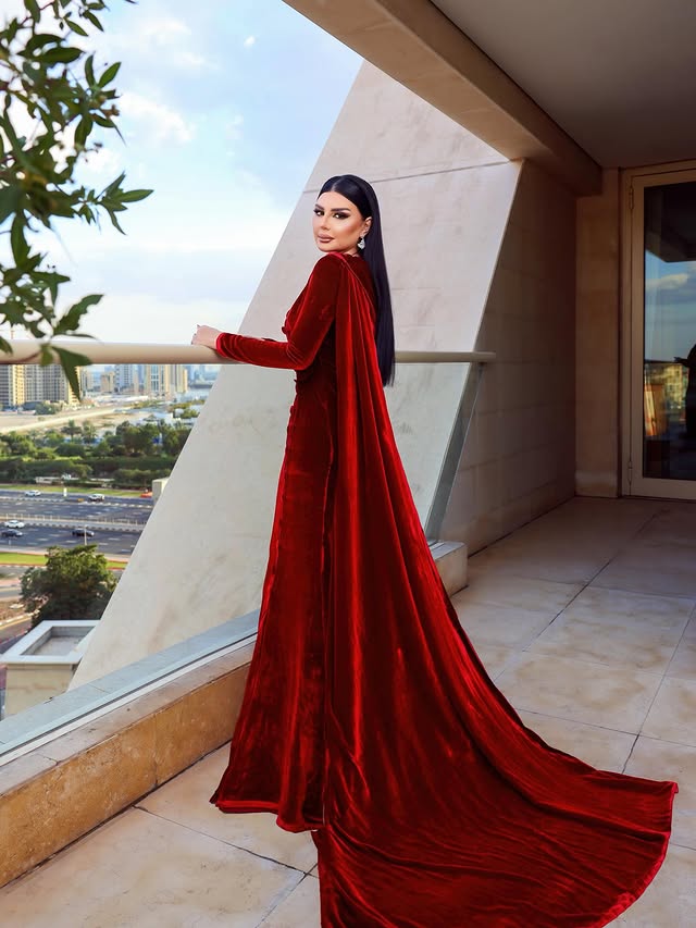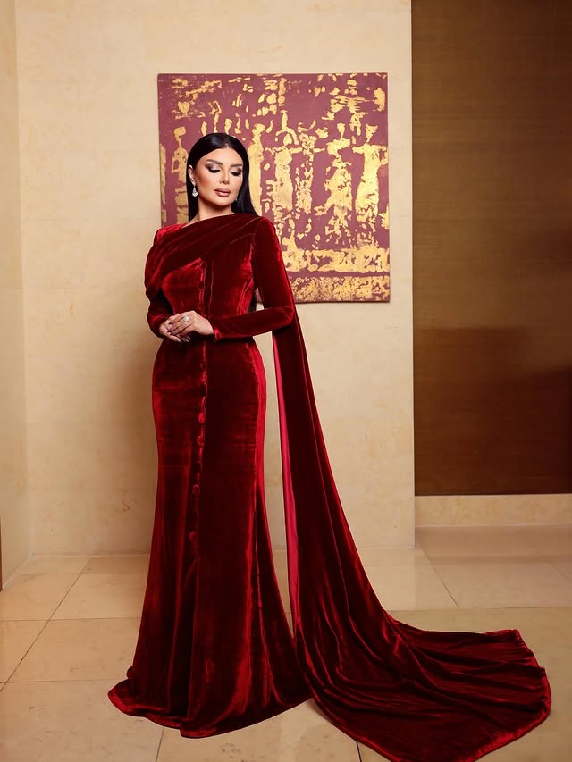 أصيل همام جسدت الأناقة الشتوية الراقية بفستان مخمل برغندي طويل بقصة المرميد، مع تفاصيل Draped مائلة وأزرار أمامية، وكاب طويل من الكتف ينسدل كذيل ملكي. الأناقة اكتملت بمكياج ترابي دافئ وتسريحة شعر ناعمة، تحت إشراف فريق عمل متخصص، لتكون الإطلالة مثالًا للفخامة والدراما الشتوية في استقبال 2026.