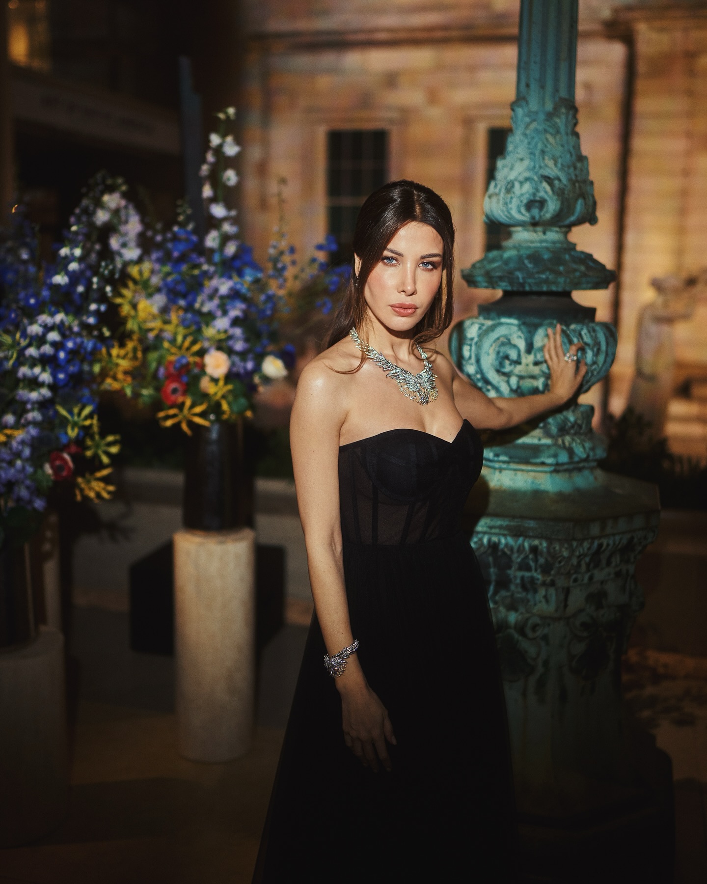 فستان أسود وقطع ذهبية من Jean-Louis Sabaji: في بيروت، نسّقت النجمة إطلالة كلاسيكية باللون الأسود المرصّع بالفضة مع قطع ذهبية وألماس من Tiffany & Co، ليكون مزيجًا مثاليًا من الفخامة والحداثة.