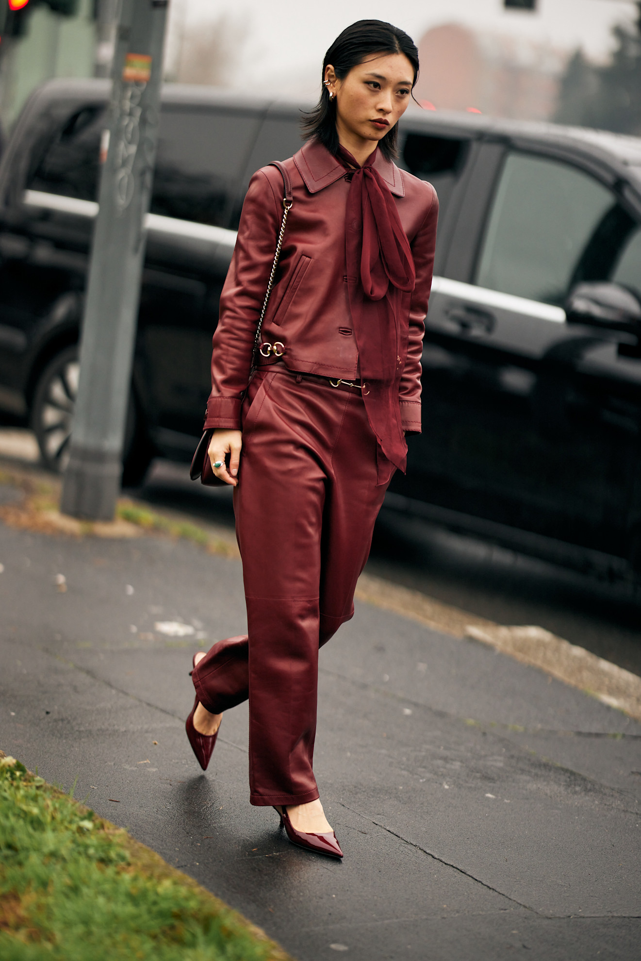 في إطلالة لافتة من Street Style، جاء الطقم البرغندي بقماش الجلد، مؤلفًا من جاكيت وسروال، مع حذاء وحقيبة من اللون نفسه، ليؤكد أن الإطلالة الرسمية يمكن أن تكون جريئة دون أن تفقد رصانتها. خيار مثالي لمن تبحث عن تميّز ذكي في بيئة العمل.