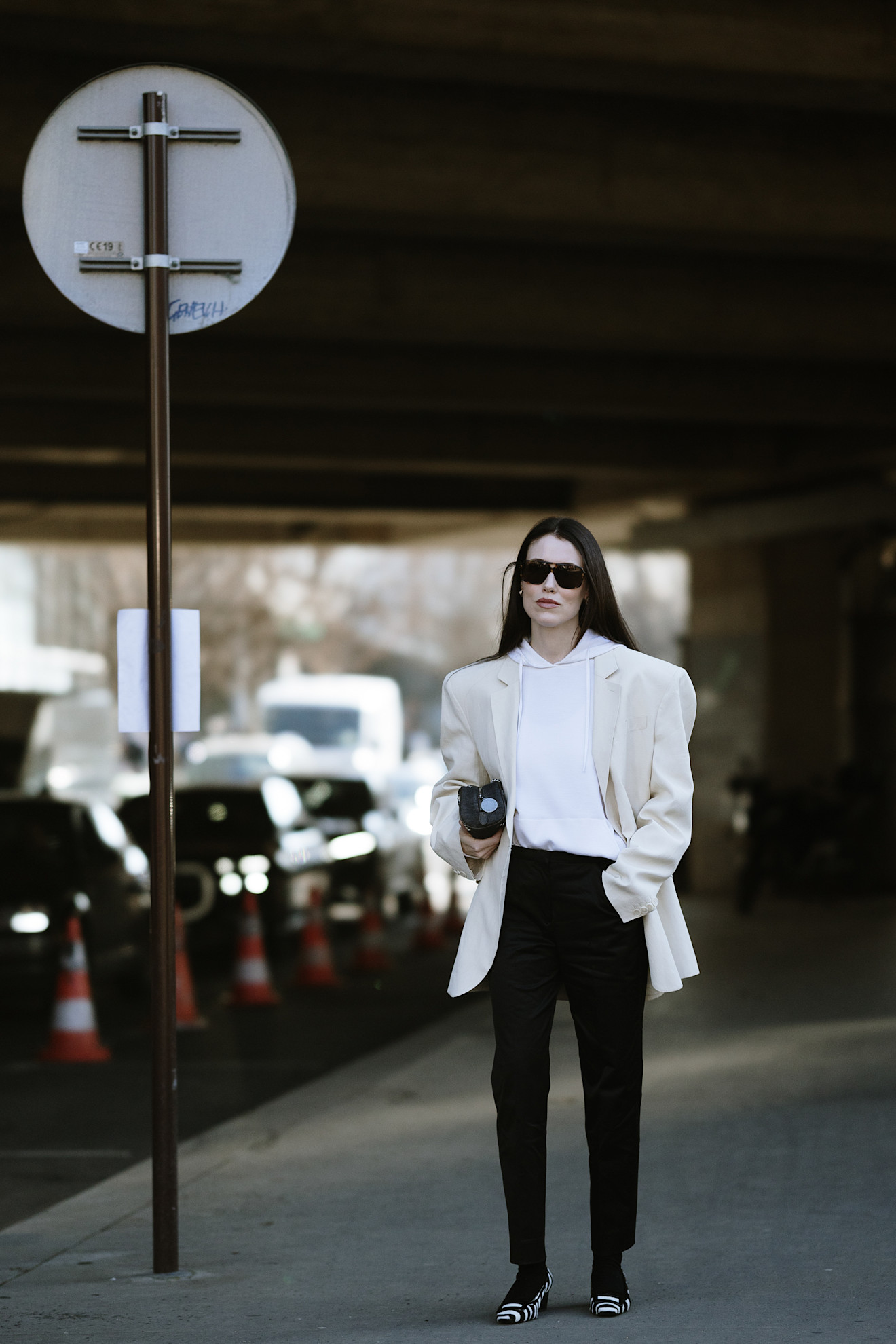 يمكن اعتماد البلايزر الكلاسيكية مع سروال جلد، دنيم داكن، أو حتى مع هودي ناعم لإطلالة تجمع بين الرسمية والعصرية. في ستريت ستايل مميز، تم تنسيق بلايزر بيج كلاسيكية مع هودي أبيض، سروال أسود، وحذاء بنقشة الزيبرا، في مزيج ذكي يكسر الجمود دون الإخلال بهيبة اللوك الرسمي.