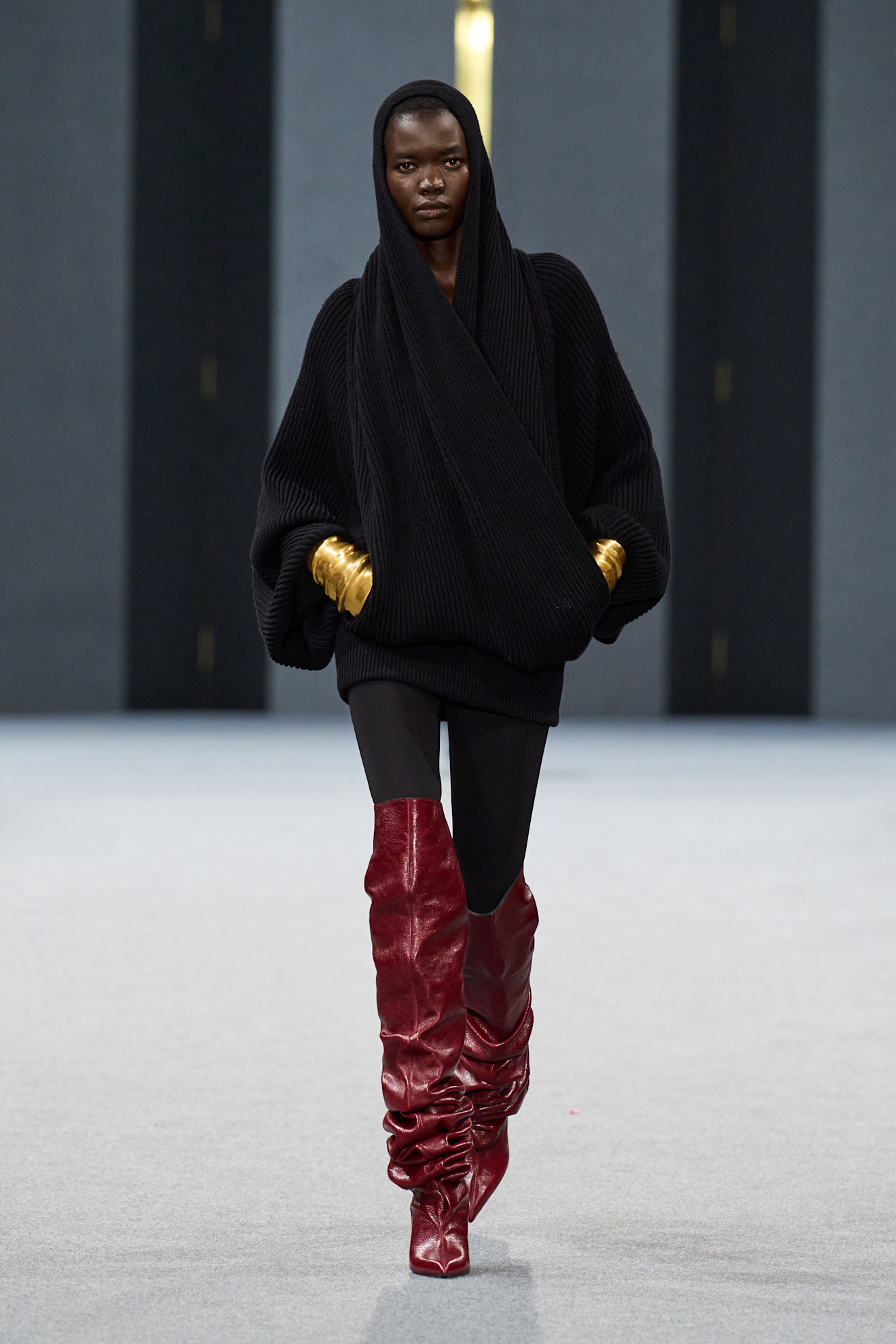 في المقابل، اتجهت بعض التصاميم إلى البساطة المدروسة، حيث تعكس القصّات الواضحة قوة الأناقة الهادئة. من Alaïa، جاء الحذاء الذي يصل إلى الفخذ منسقًا مع إطلالة عاجية متجانسة، ليعبّر عن أنوثة عصرية تعتمد على الصفاء البصري لا على الزخرفة.