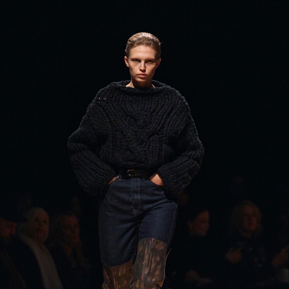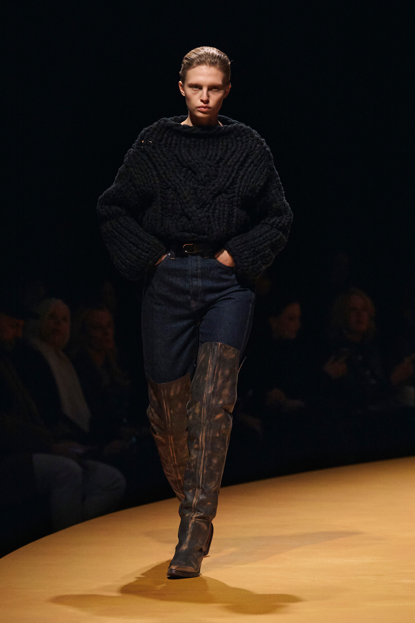 على النقيض، برز الحذاء الطويل بأسلوب أكثر عفوية مستوحى من الغرب الأميركي. هذا التوجه يؤكد أن الـOver the Knee ليس حكرًا على الإطلالات الرسمية، بل يمكن اعتماده في تنسيقات يومية مريحة. من Khaite، جاء الحذاء البني بأسلوب رعاة البقر منسقًا مع الجينز وكنزة صوفية، في لوك عملي وأنيق في آن واحد.