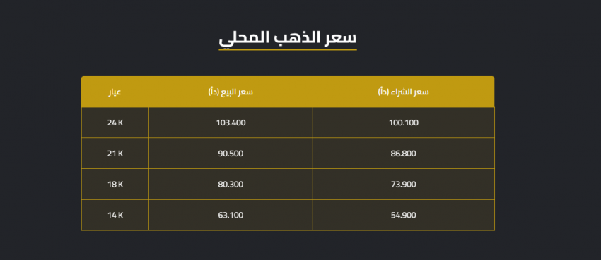 وبحسب التسعيرة بلغ سعر الغرام الواحد من الذهب عيارات 24 و18 و14 لغايات البيع من محالّ الصاغة عند 103.40 و 80.30 و63.10 دينارا على الترتيب.
