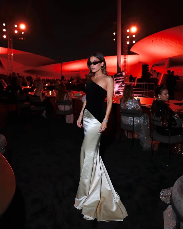 قدمت النجمة إلهام علي إطلالة جمعت بين الكلاسيكية والجرأة العصرية، من توقيع كريستيان عبد الله وبتنسيق من إيلي شنتف. اختارت فستانًا أسود ضيقًا أبرز القوام ببراعة، بينما كان العنصر الأبرز في التصميم هو الياقة غير المتماثلة المزينة بفيونكة بيضاء ضخمة غطت أحد الكتفين، لتتحول إلى نقطة جذب درامية بامتياز.