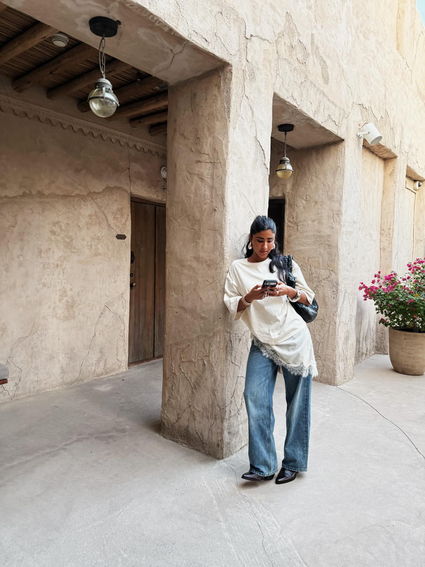 كما برز حبها للقصّات المريحة في الجينز الواسع والبلوزات البيضاء غير المتماثلة، وإطلالات بسيطة تعتمد على الأبيض والبيج مع لمسات سوداء تمنح التوازن دون تعقيد.