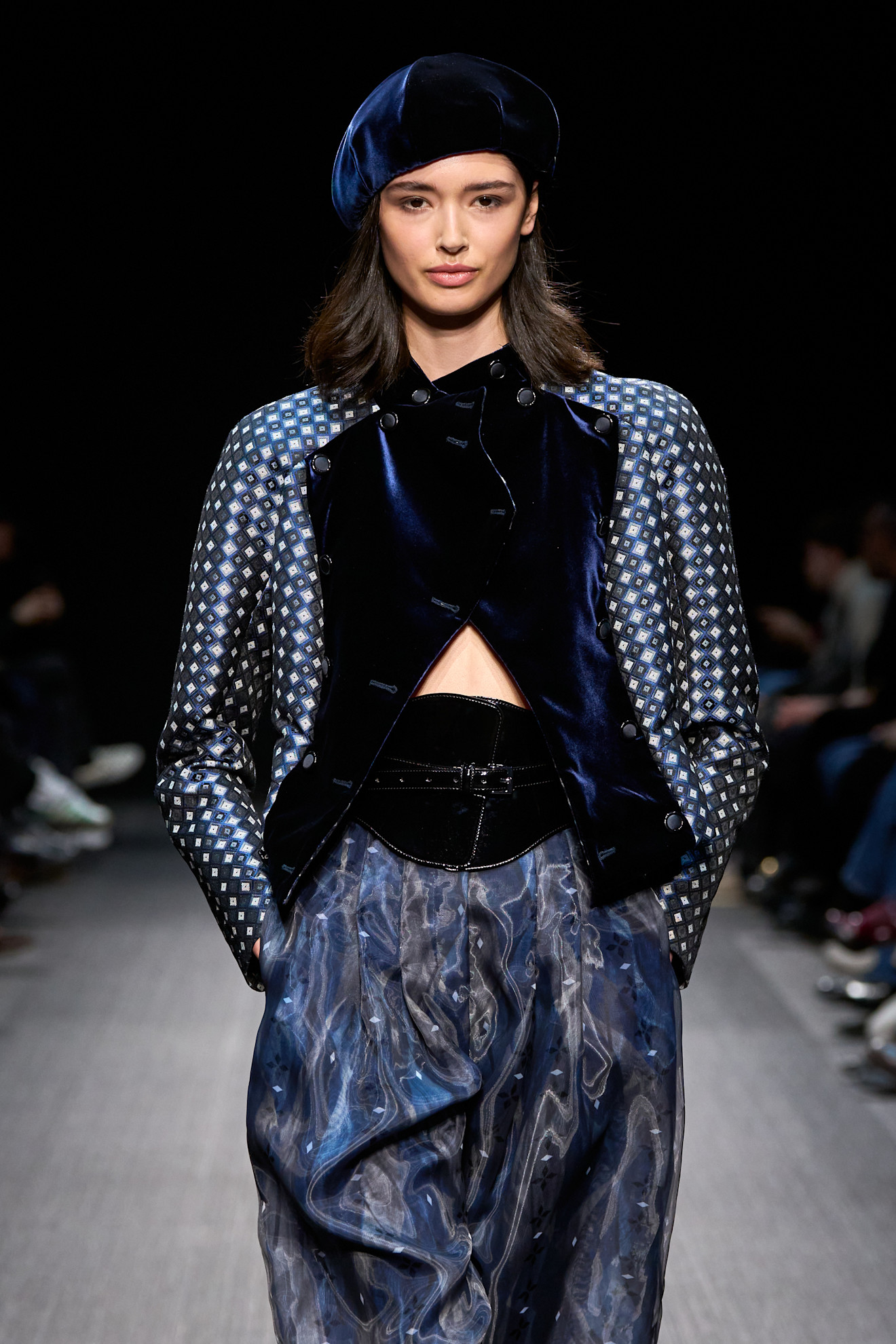 إطلالات Emporio Armani تؤكد أن القبعة المخملية باللون الداكن خيار مثالي لإطلالات راقية وكلاسيكية تضيف حضوراً قوياً دون مبالغة.
