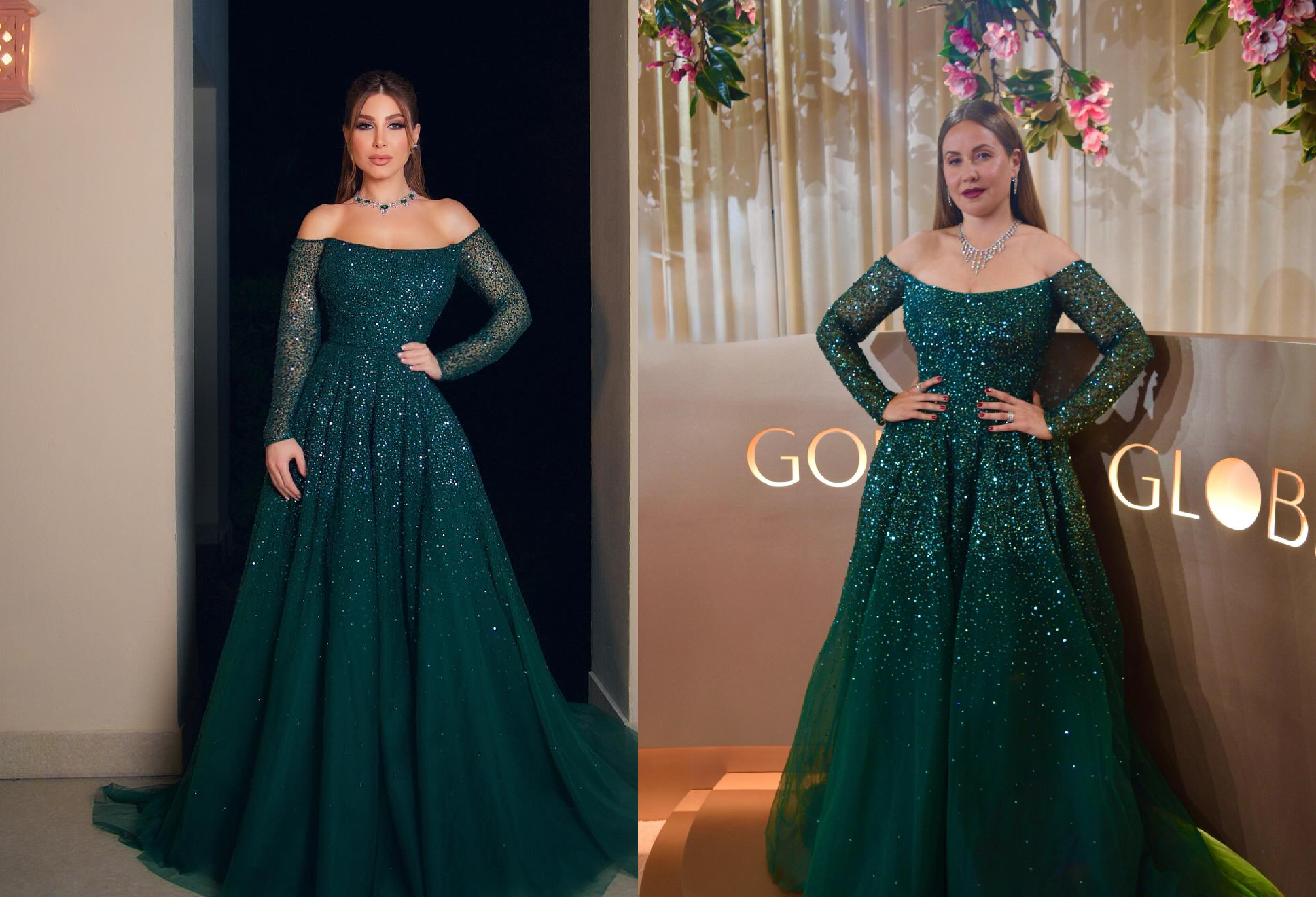 الإعلامية ريا أبي راشد حافظت على خطها الأنيق بفستان أخضر زمردي من Monique Lhuillier، بقصة أوف شولدر مرصعة بالكريستال وذيل درامي. إلا أن الإطلالة أثارت بعض المقارنات مع فستان سابق أطلت به يارا بتوقيع Esposa Privé، تشابه في اللون والطابع العام، مع اختلاف واضح في التفاصيل والتنفيذ.