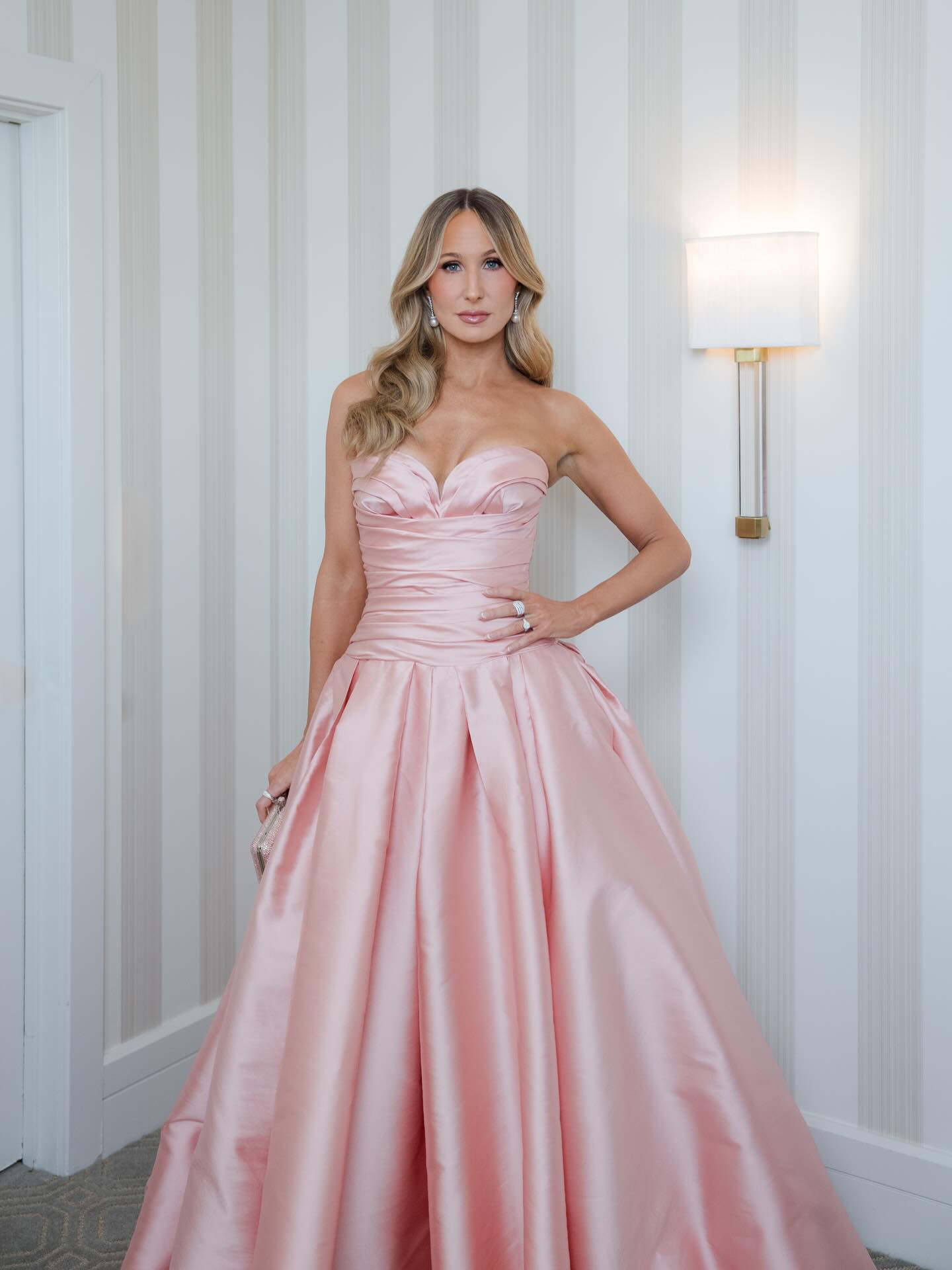 نيكي غلاسر تألقت بفستان أنثوي من توقيع زهير مراد، جاء من الساتان الوردي بقصّة أميرية ناعمة وكورسيه يبرز الخصر بتناغم أنيق، ليعكس توقيع مراد المعروف بالرومانسية الراقية.
