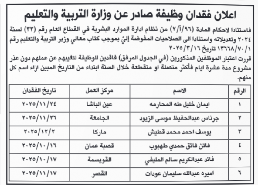كما نبهت مؤسسات وزارات أخرى، موظفين إلى فقدان وظائفهم بسبب تغيبهم عن العمل بدون عذر رسمي.