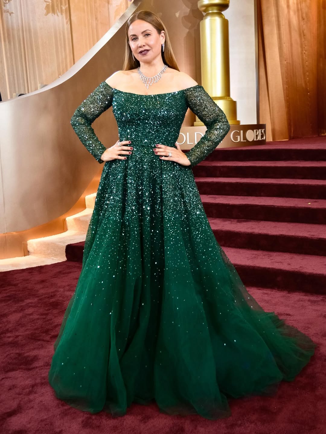 في حفل غولدن غلوب 2026، خطفت ريا أبي راشد الأنظار بفستان أخضر زمردي فاخر من توقيع Monique Lhuillier. التصميم تميّز بقصّة أوف شولدر مع أكمام شفافة مرصّعة بالكريستال، تنسدل بكثافة متدرجة نحو تنورة منتفخة بالكسرات العريضة وذيل خلفي أنيق.