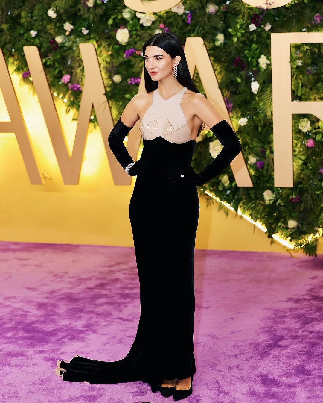أطلت توبا بويوكستون بفستان طويل من المخمل الأسود، تميّز بتفصيل جلدي بلون بيج عند الصدر وياقة هالتر متداخلة. القفازات المخملية العالية والمجوهرات المرصعة منحت الإطلالة شخصية قوية وأناقة غير تقليدية.