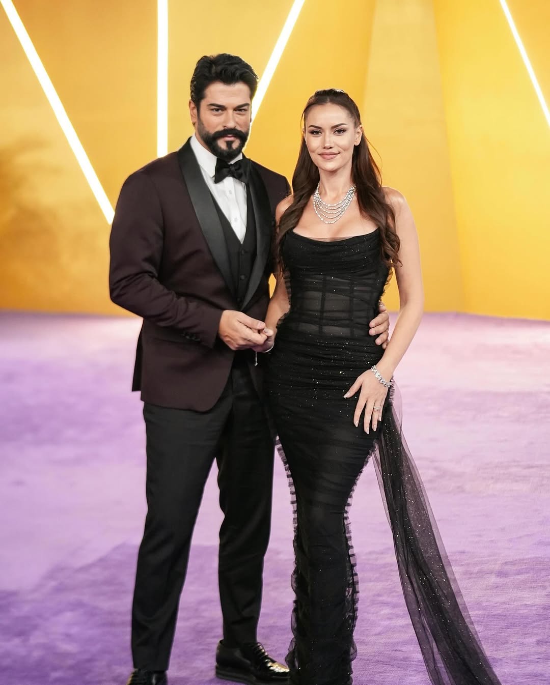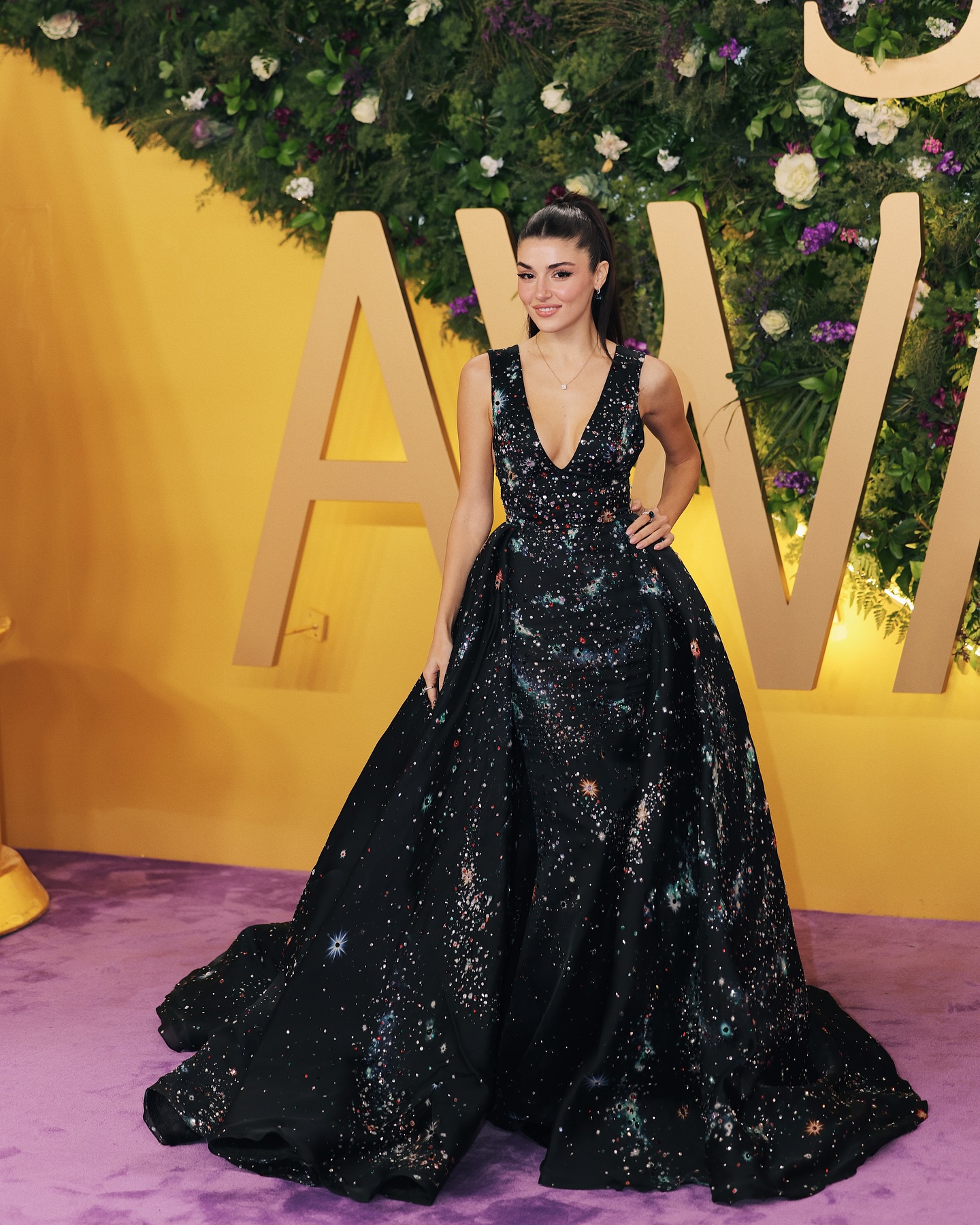 لفتت هاندا أرتشيل الأنظار بفستان أسود طويل بقصة واسعة، مرصع بتطريزات براقة متعددة الألوان تشبه النجوم. قصة الصدر العميقة والأكتاف المكشوفة أضافت جرأة أنيقة، دون أن تفقد الإطلالة فخامتها.