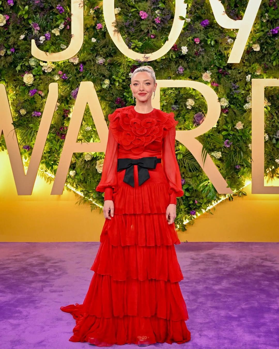 خطفت أماندا سيفريد الأنظار بفستان أحمر صريح من توقيع فالنتينو، تميز بياقة دائرية مزينة بالكشكشة، وأكمام شفافة واسعة، وتنورة متعددة الطبقات. الحزام الأسود على شكل فيونكة أضاف تباينًا أنيقًا عزز جمالية التصميم.