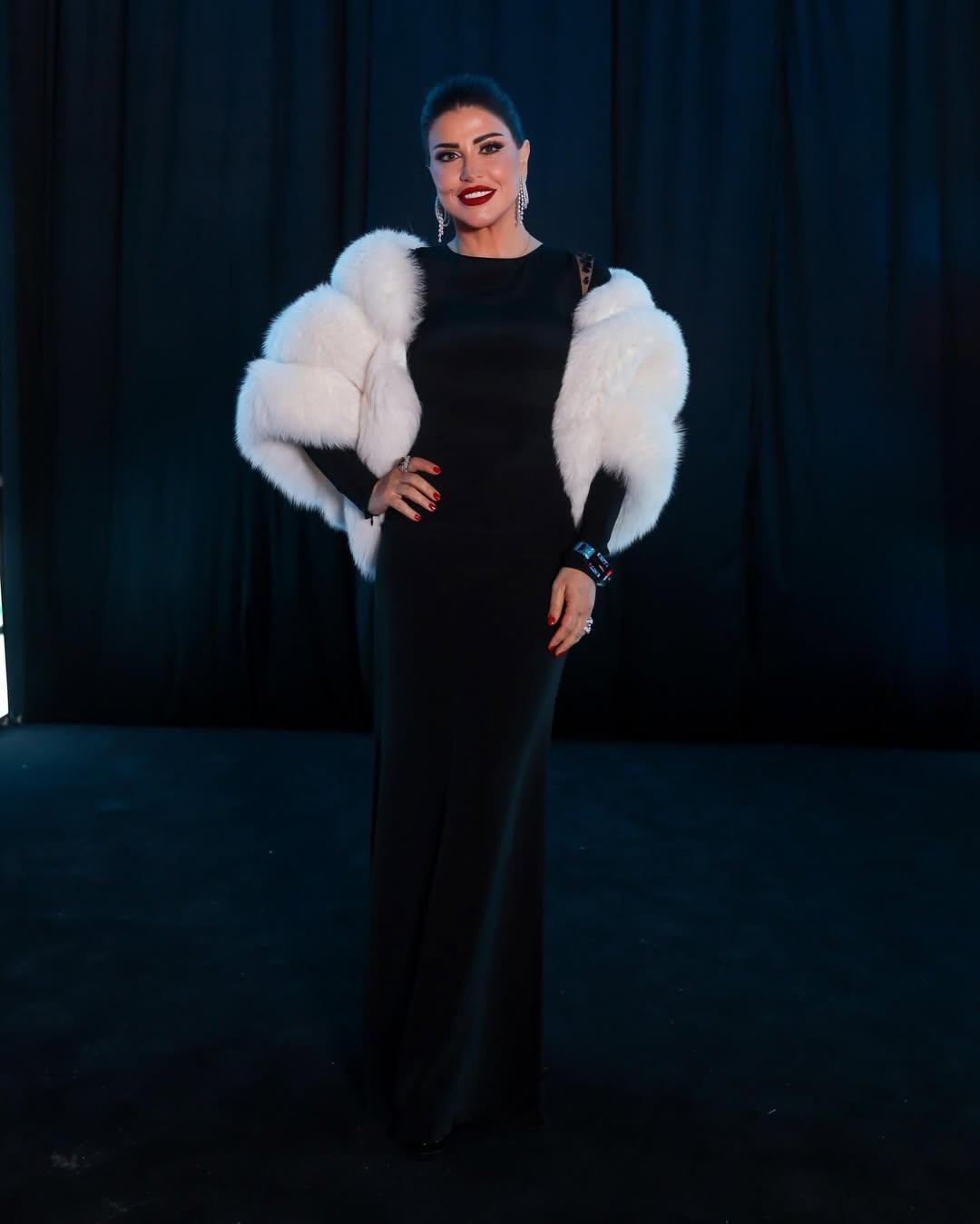 أما جومانا مراد، فنسّقت وشاح فرو أبيض مع فستان أسود طويل، لتخلق تباينًا أنيقًا يعكس فخامة هادئة تناسب الأجواء الشتوية.