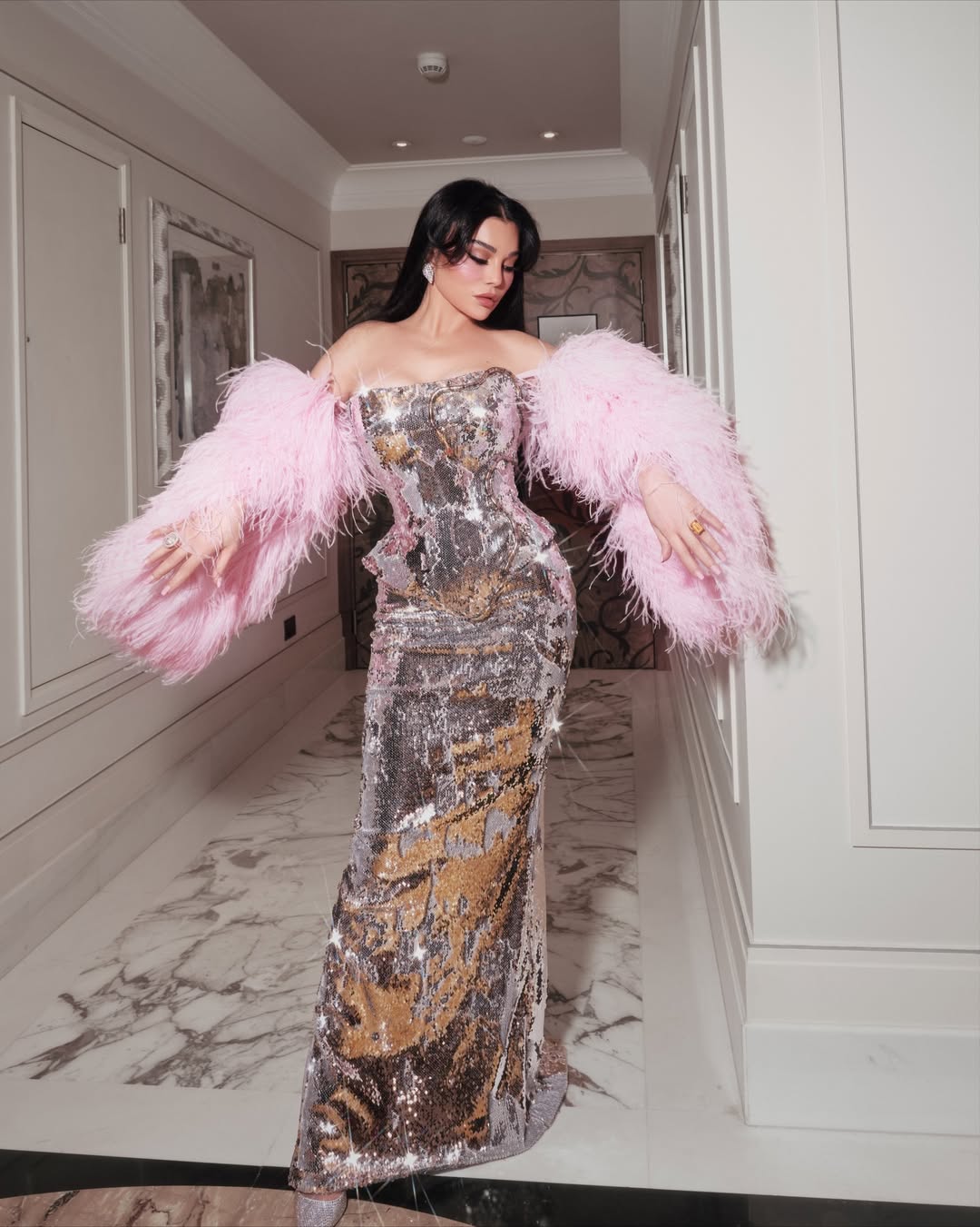 هيفاء وهبي اختارت وشاحًا زهريًا من الريش على شكل أكمام منفصلة، رافق فستانًا فضيًا مرصعًا بالترتر، ليضيف نعومة وأنوثة إلى تصميم لامع.