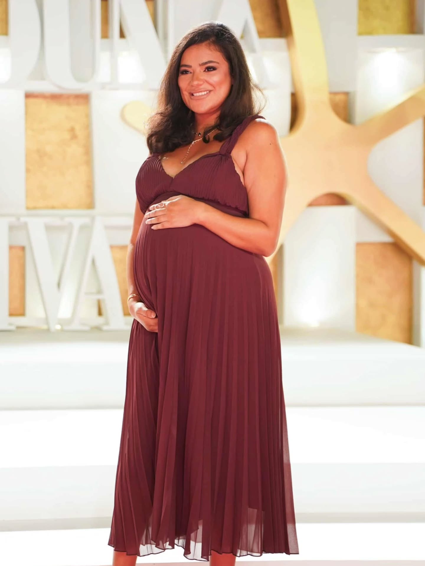 ثراء جبيل عبّرت عن سعادتها بالحمل المتقدم بفستان برغندي انسيابي، حمل مزيجًا من الراحة والأنوثة. اختيار اللون وحده كان كافيًا ليمنح الإطلالة دفئًا وأناقة بلا تكلّف.
