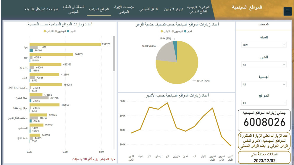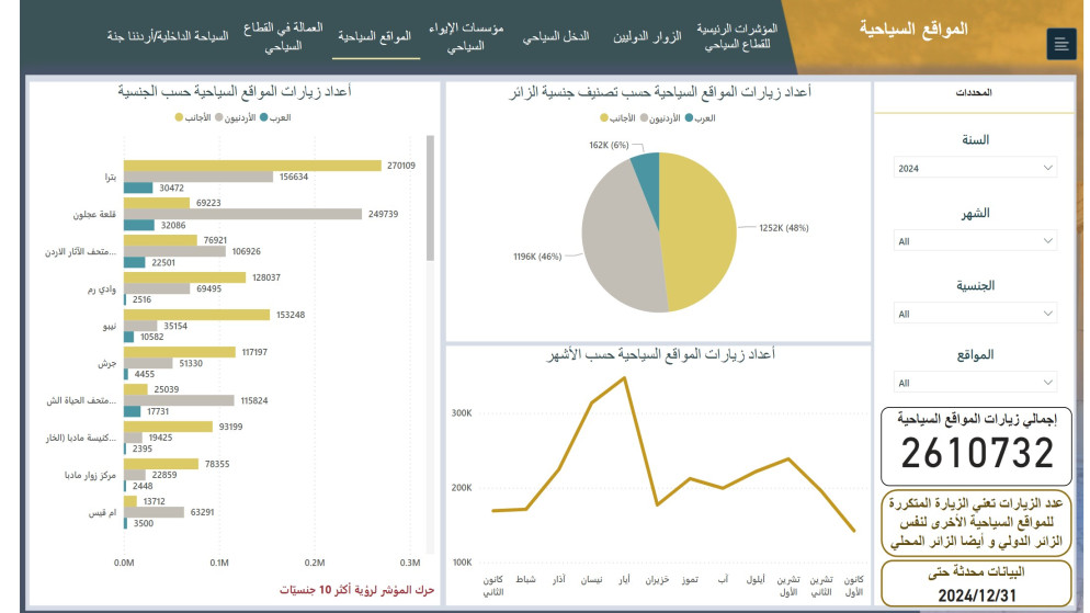وبالعودة للعام 2024 فبلغ إجمالي زيارات المواقع السياحية 2,610,732 زيارة، بينما وصل العدد في العام 2023 والذي يعد عاما قياسيا للقطاع السياحي 6,008,026.