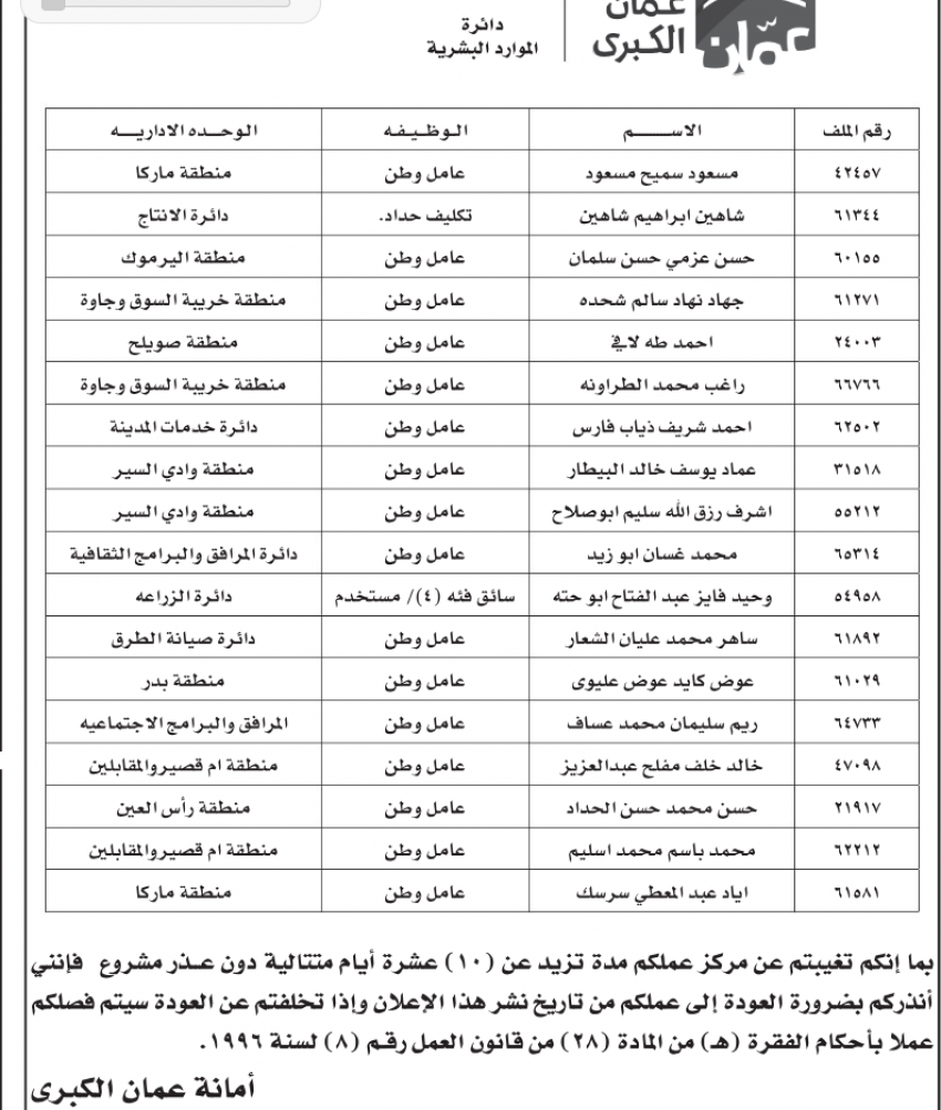 للعلّم - أنذرت أمانة عمان الكبرى عدد من الموظفين لديها بالعودة إلى العمل بعد تغيبهم بدون عذر رسمي لفترة تجاوزت الحدود القانونية.