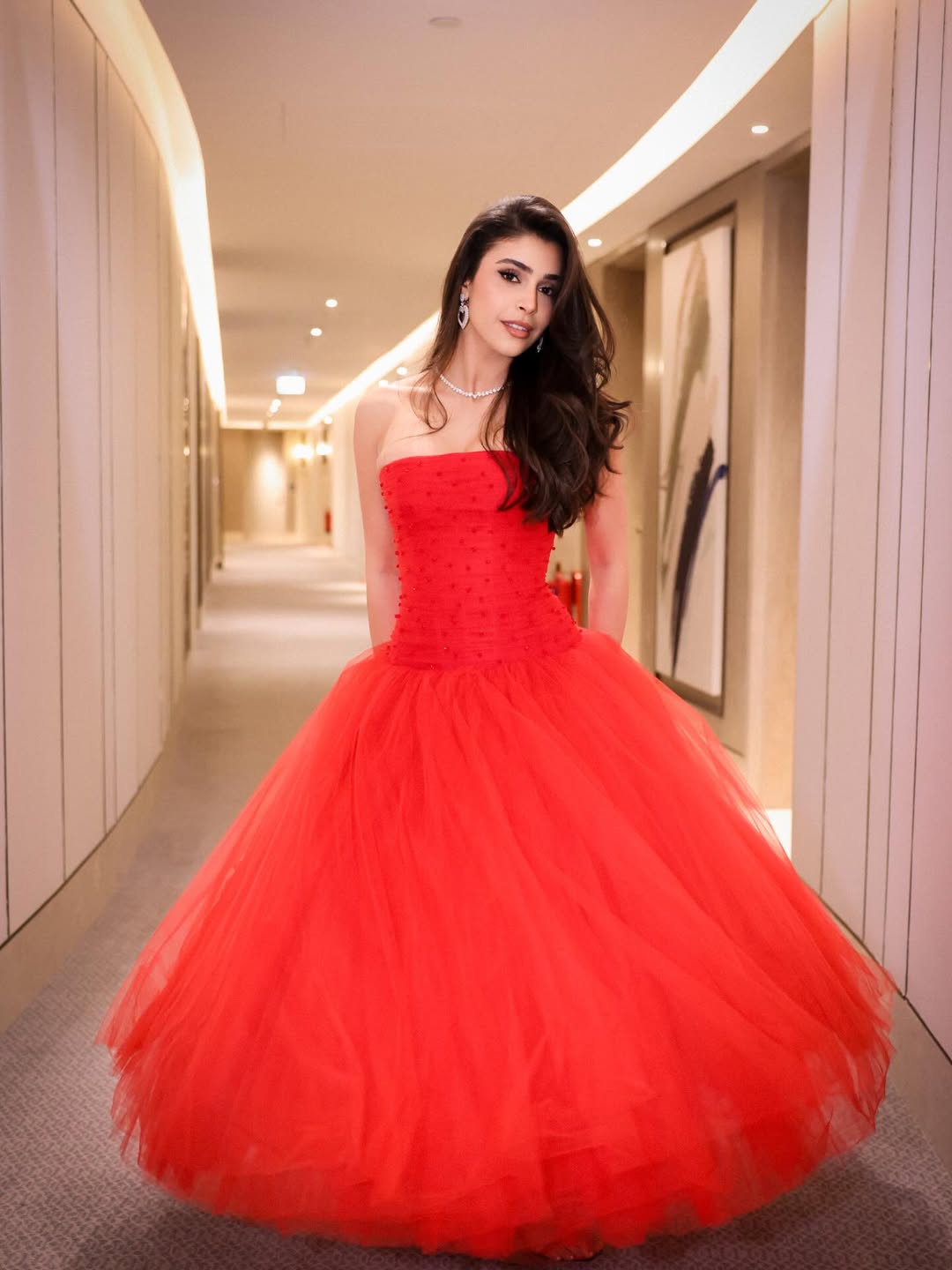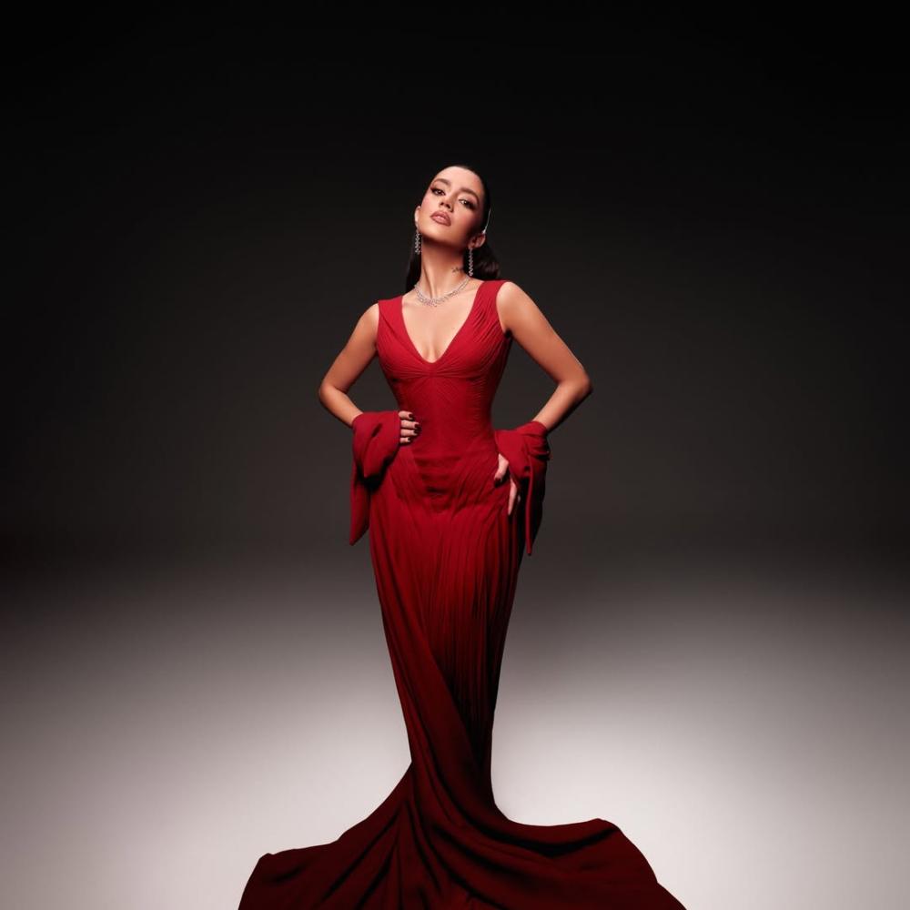 كارمن بصيبص: فستان أحمر بطابع ملكي، درابيه غني بالثنيات وذيل منتفخ، مع صندل أحمر ومجوهرات Bulgari.