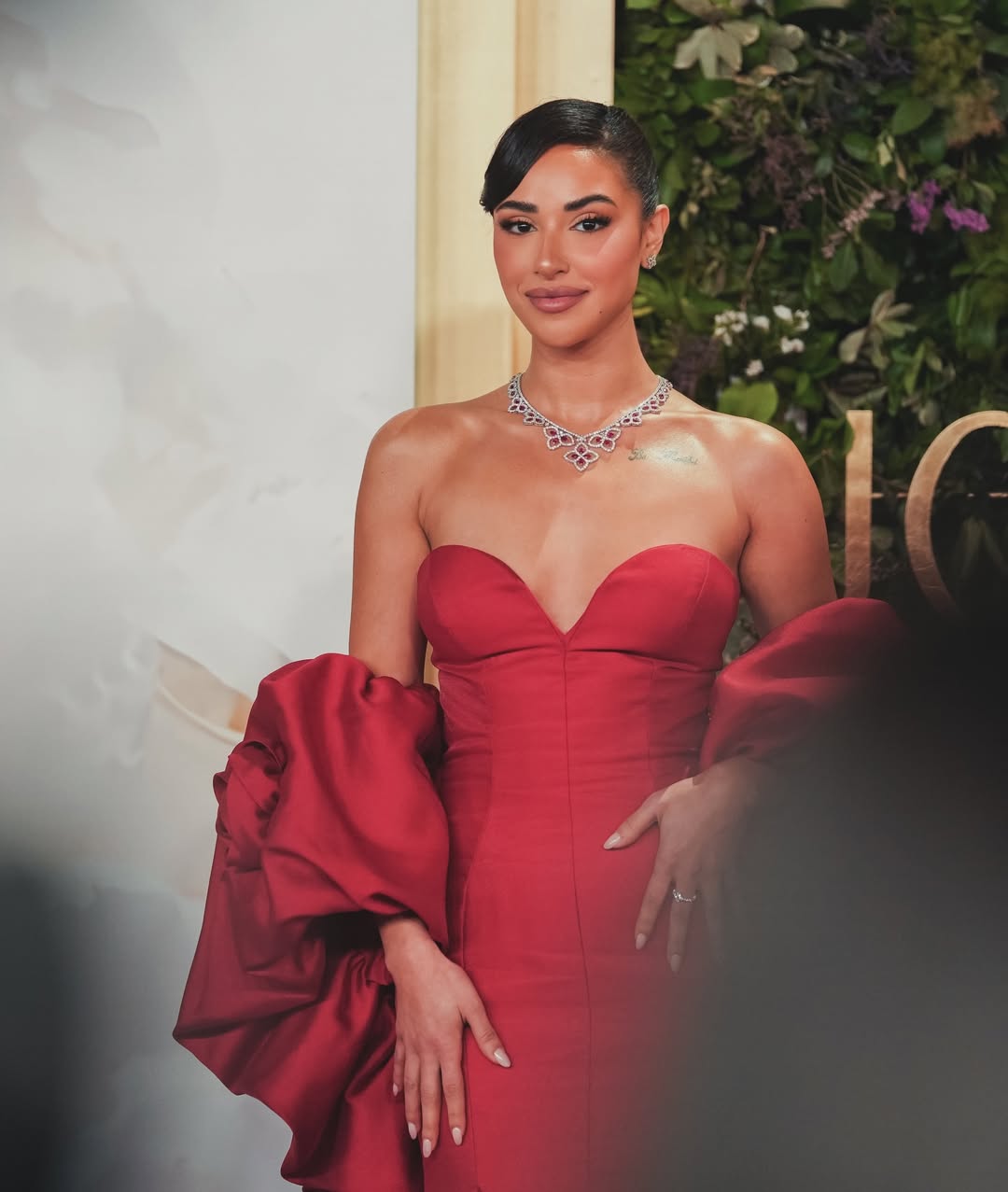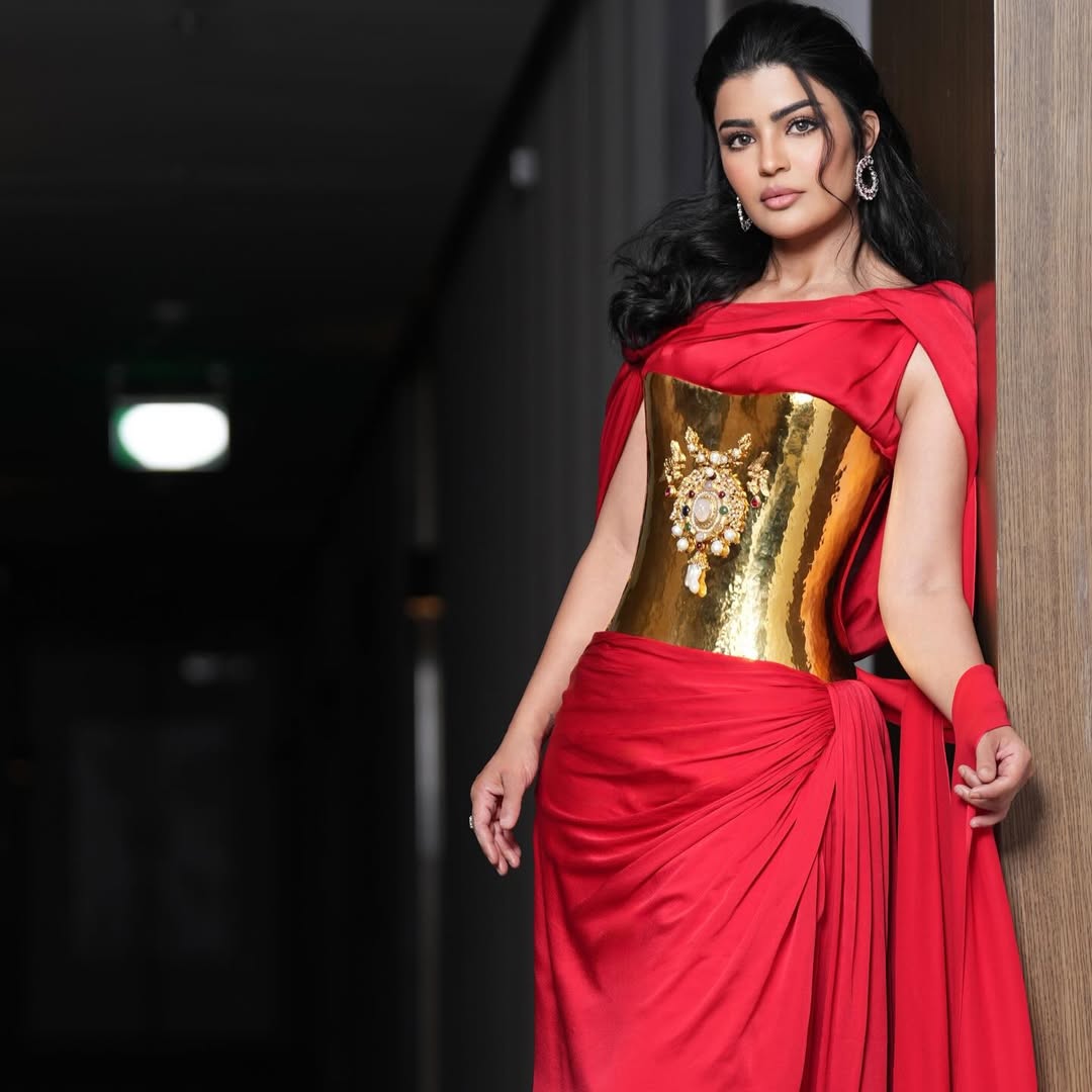 ميلا الزهراني: فستان أحمر بكتف معقود وآخر منسدل، مع كورسيه ذهبي وتطريز معدني، ومجوهرات وحقيبة ذهبية.
