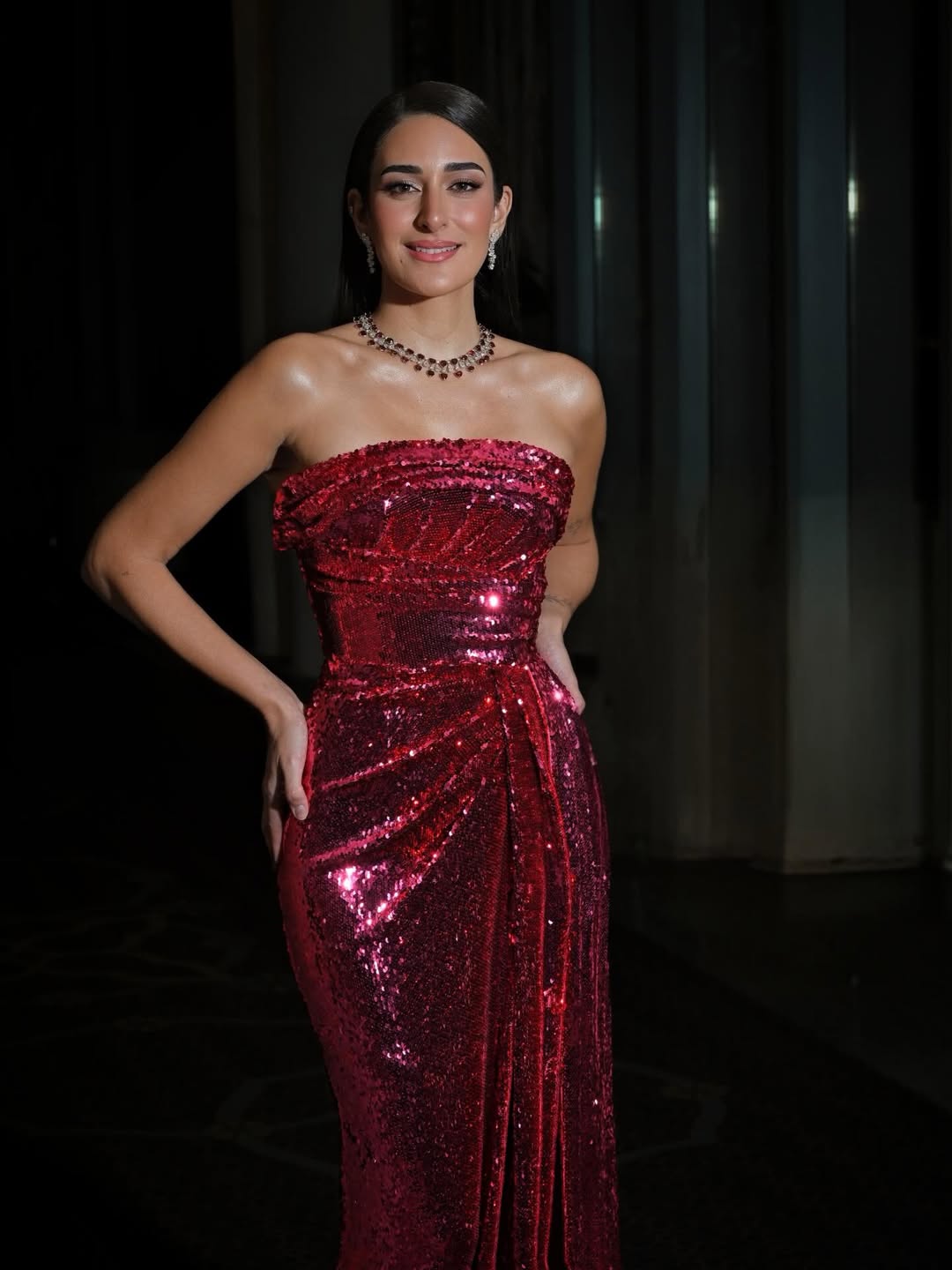 أمينة خليل: فستان ترتر أحمر من زهير مراد، بفتحة ساق عالية وخصر محدد، أكملت الإطلالة بمجوهرات Chopard.