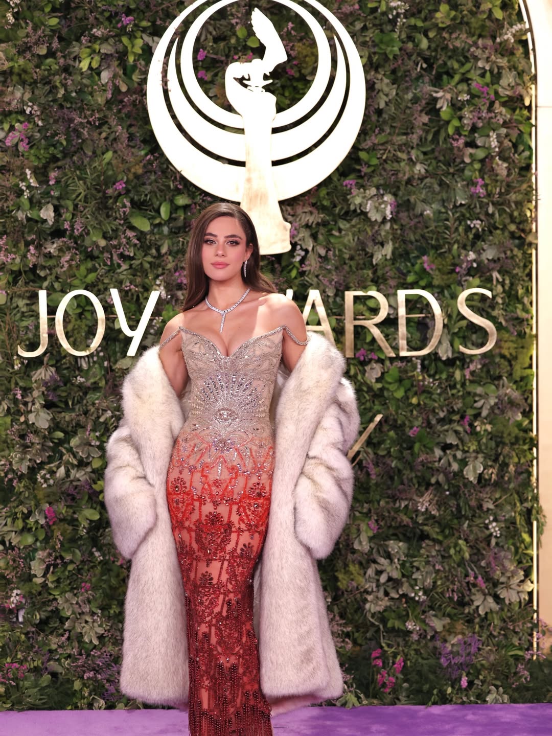 أندريا طايع: فستان مزين بالكريستال بتدرجات الأحمر والفضي، مع معطف فرو أوفر سايز ومجوهرات Bulgari.