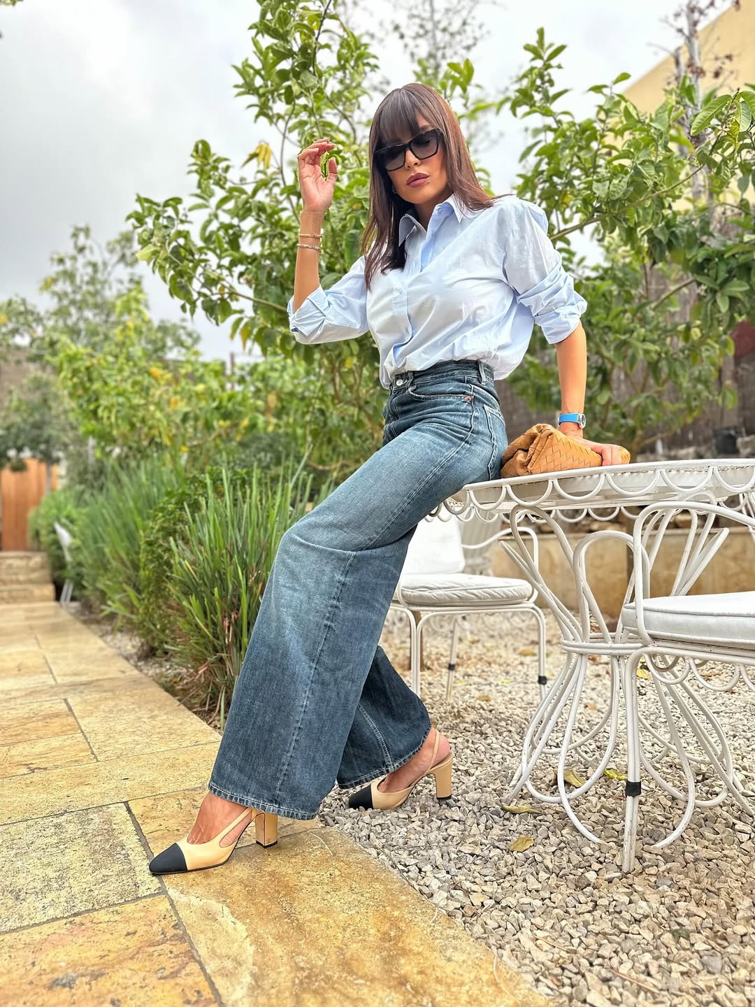 بنطال دنيم شاحب واسع مع توب أزرق فاتح وحذاء كلاسيكي، كلاتش جلد مجدول، وشعر مالس بالغرة الأمامية.