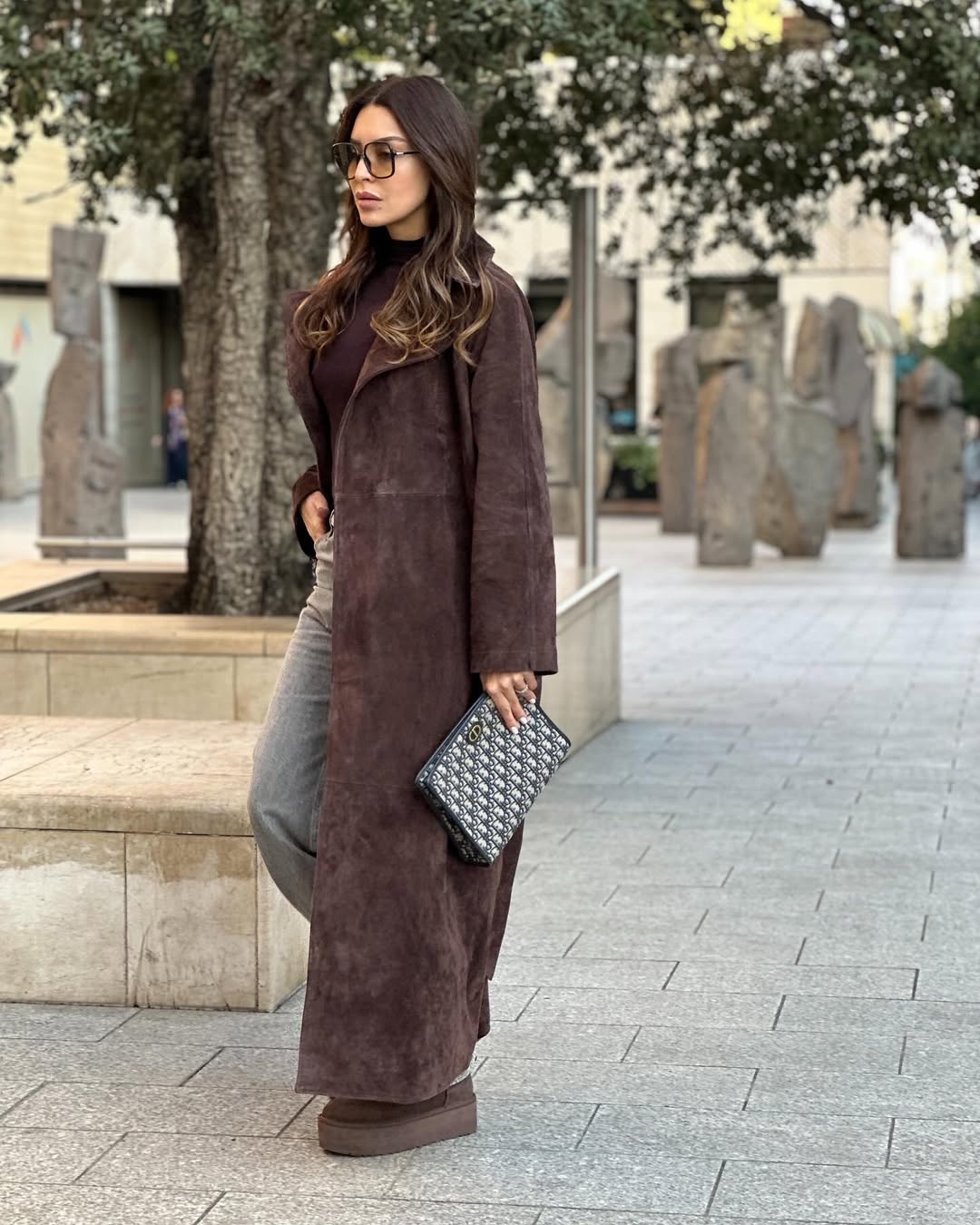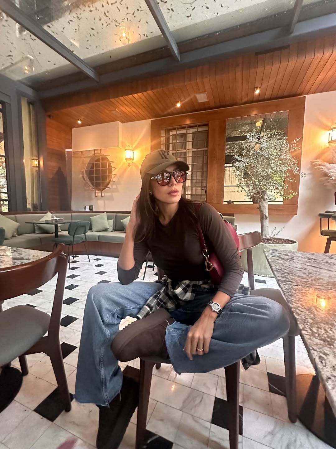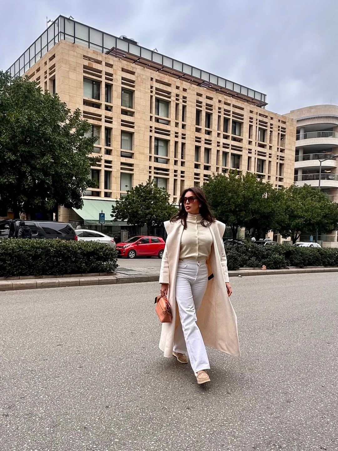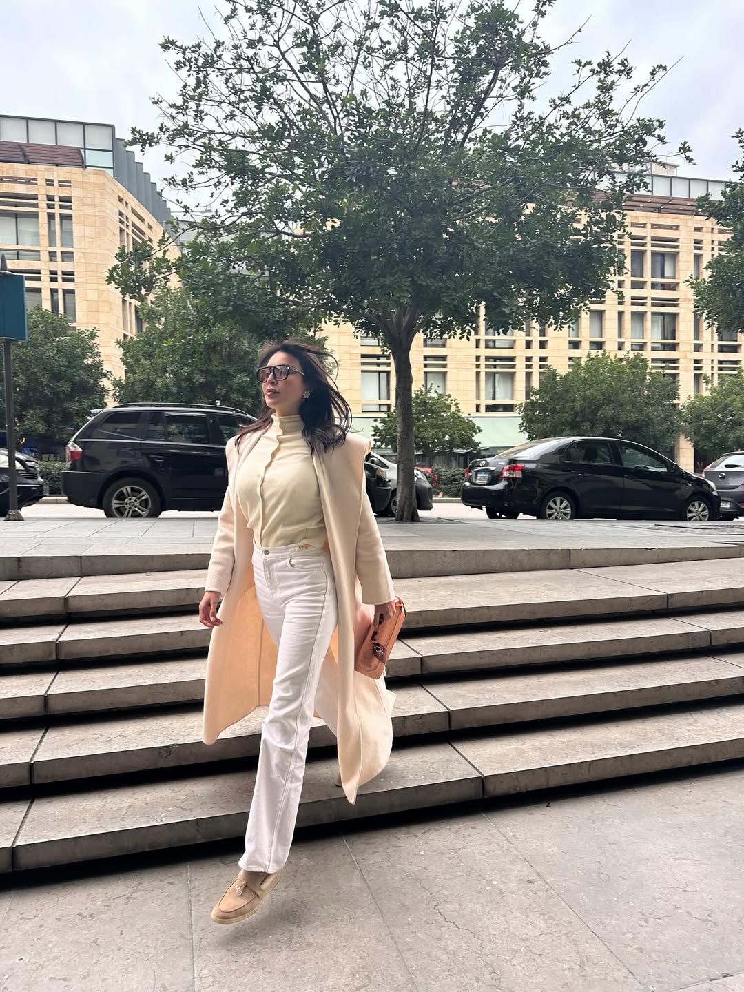 أكملت الإطلالة بحذاء موكاسان مسطح، حقيبة جلدية داكنة، أقراط مرصعة، ونظارة شمسية.