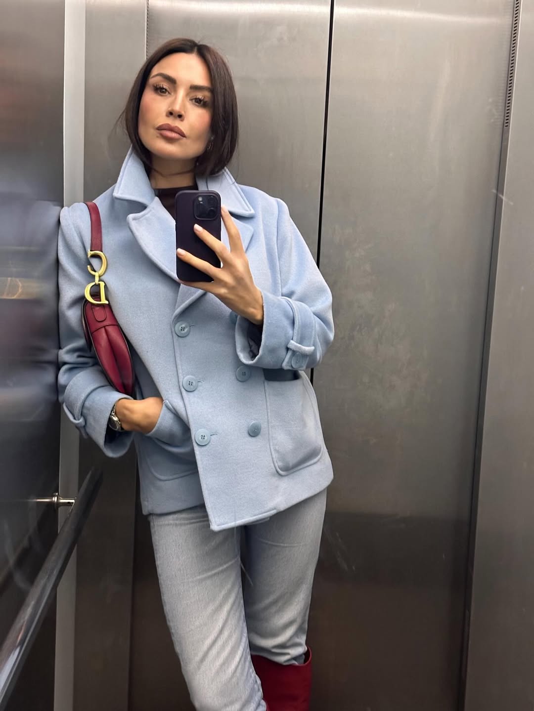 بنطال دنيم أزرق فاتح مع توب أسود وجاكيت صوفي بنفس اللون، وحقيبة كتف وبوت برغندي.