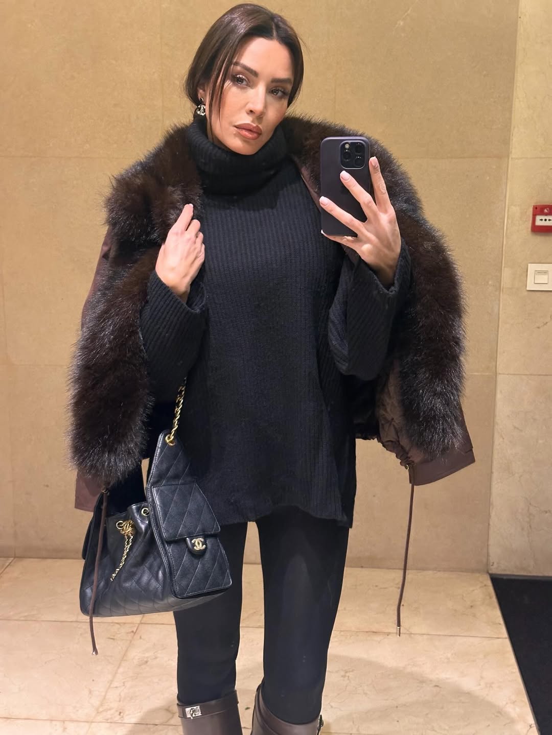 ليجن أسود مع بلوزة صوفية أوفر سايز وجاكيت بني بفرو، مع بوت جلد عالي وحقيبة شانيل.