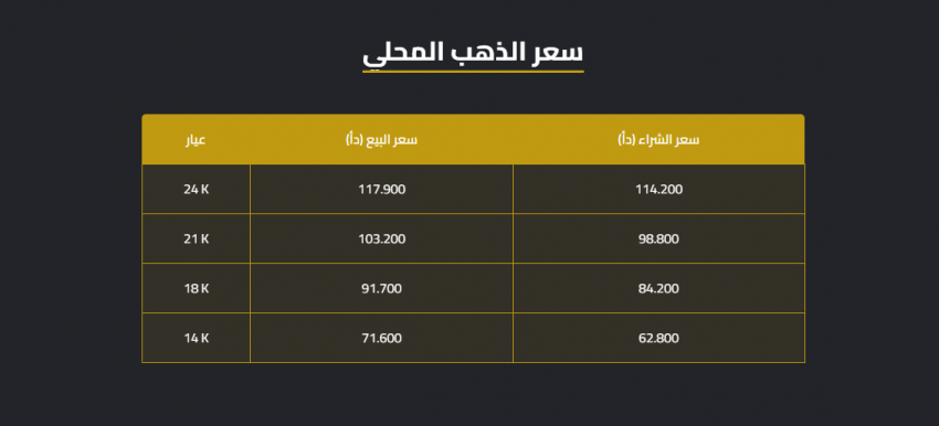 وبلغ سعر بيع غرام الذهب عيار 21 عند 103.20 دنانير و98.8 دينارًا للشراء