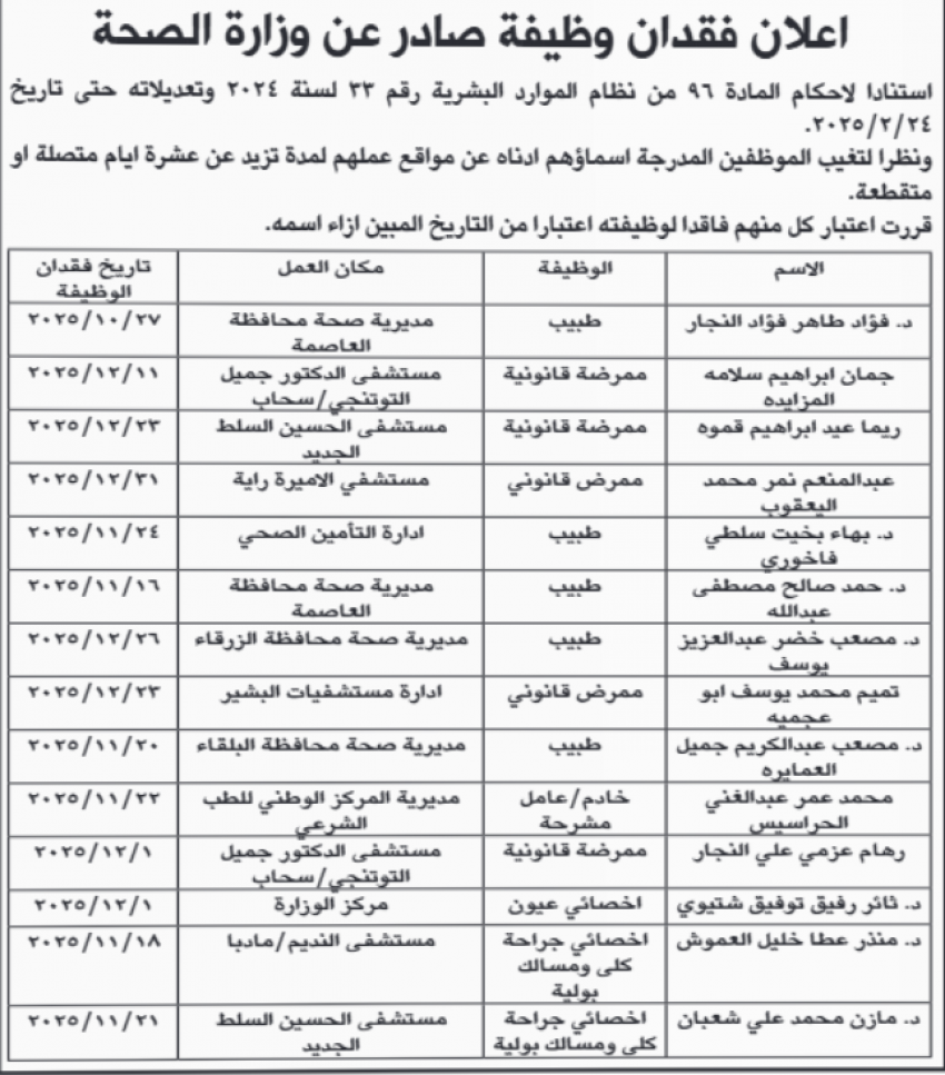 للعلّم - أعلنت دوائر حكومية عن رغبتها في ملء شواغر وظيفية في حين أعلنت دوائر أخرى عن أسماء موظفين فاقدين لوظائفهم.