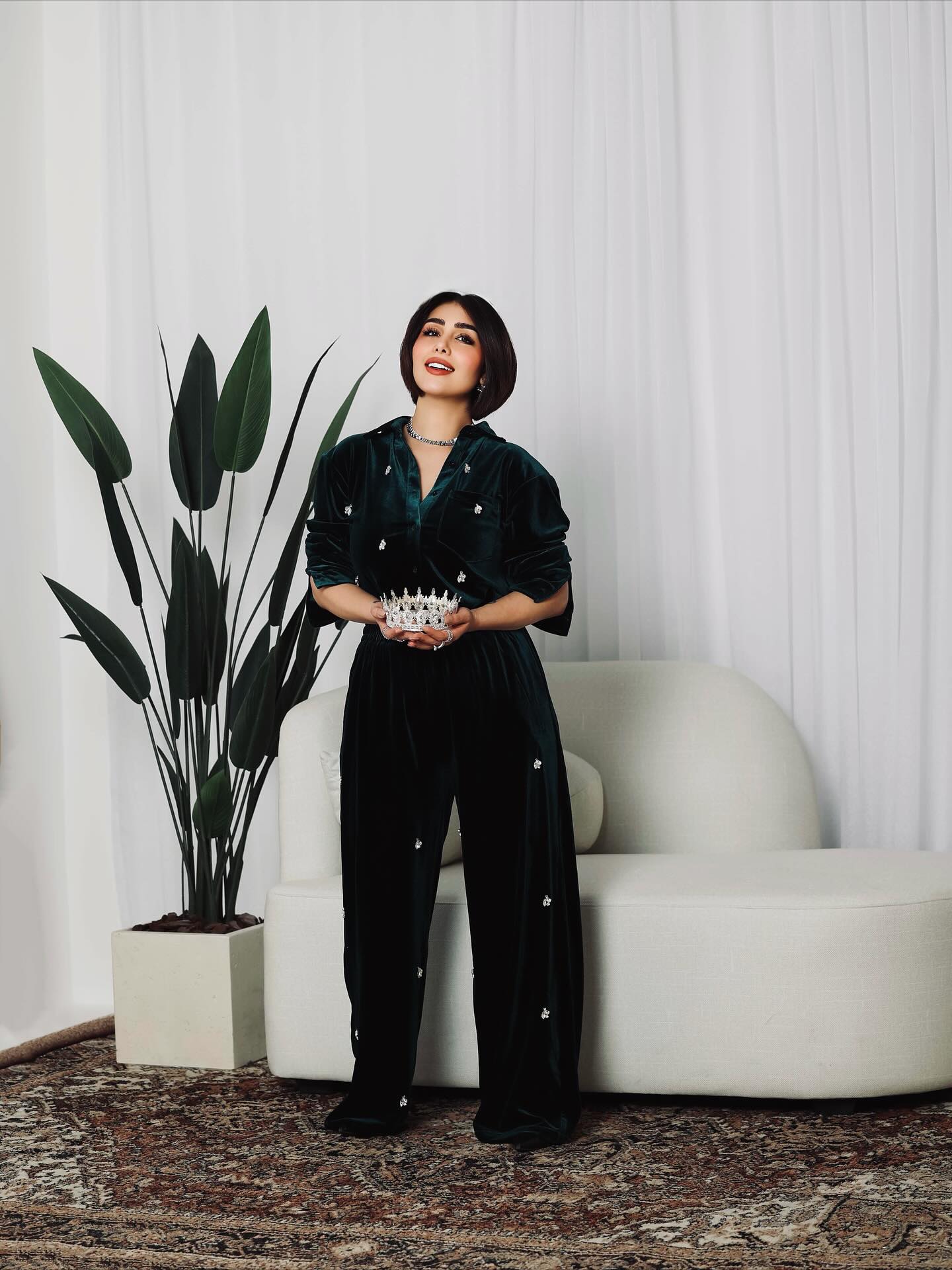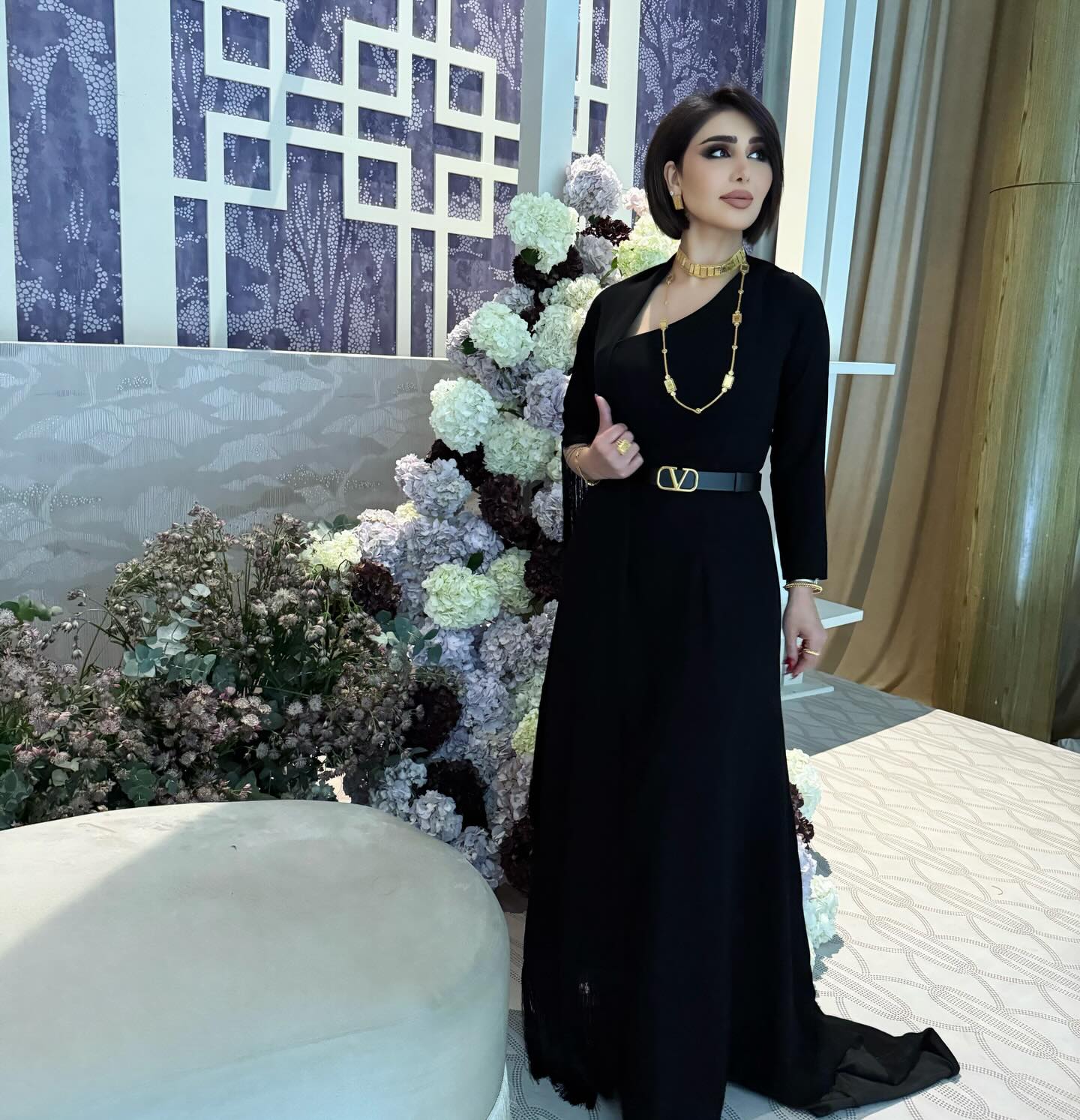 الراحة كانت ولا تزال عنصرًا أساسيًا في خزانة هنادي الكندري، حيث ظهرت بإطلالة شرقية عصرية بفستان طويل من المخمل باللون الزيتوني، تميز بقصته الفضفاضة وانسيابيته الهادئة، مع تفاصيل مبتكرة عند الصدر وأكمام واسعة منحت التصميم فخامة ناعمة وحضورًا لافتًا.