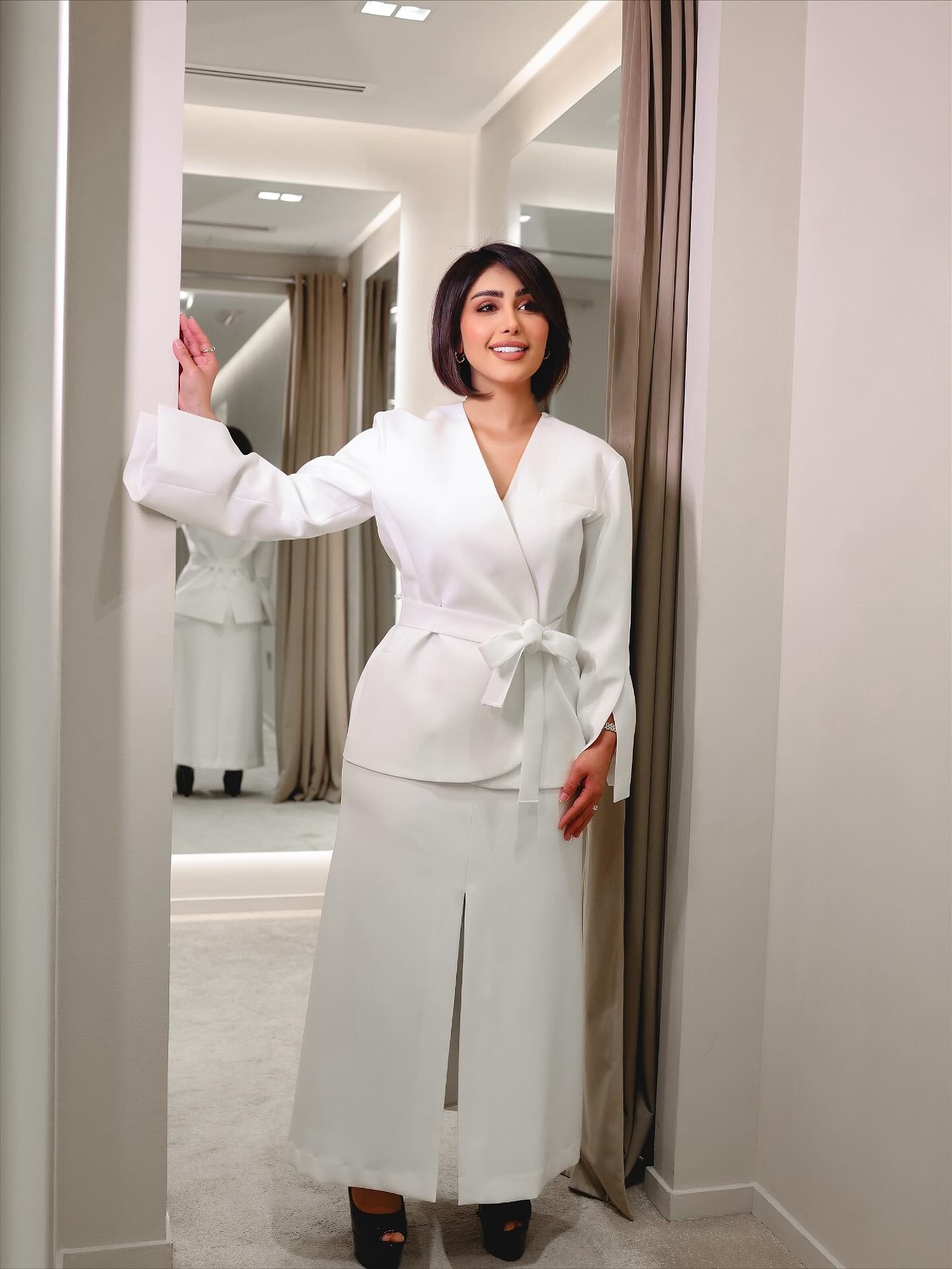 كما اختارت طقمًا أبيض ناصعًا جمع بين البساطة والرقي، تألف من جاكيت محدد الخصر بحزام أنثوي، وتنورة طويلة مستقيمة بفتحة أمامية أضفت حركة خفيفة على الإطلالة، في تنسيق يعكس ذوقًا عمليًا أنيقًا يناسب مختلف المناسبات.