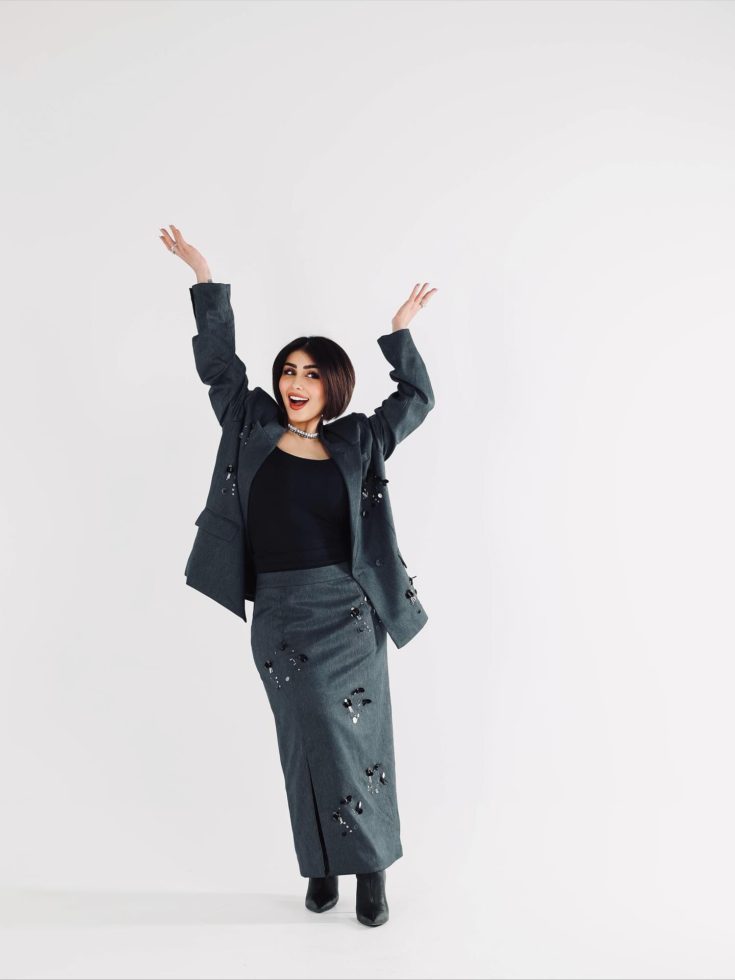وفي إطلالة أخرى، برزت هنادي بطقم رمادي أنيق جمع بين الطابع العصري والكلاسيكي، مع سترة واسعة الأكتاف مزينة بتطريزات كريستالية ناعمة، وتنورة طويلة بقصة مستقيمة، في خيار يؤكد قدرتها على اختيار القطع التي تبرز رشاقتها بهدوء.
