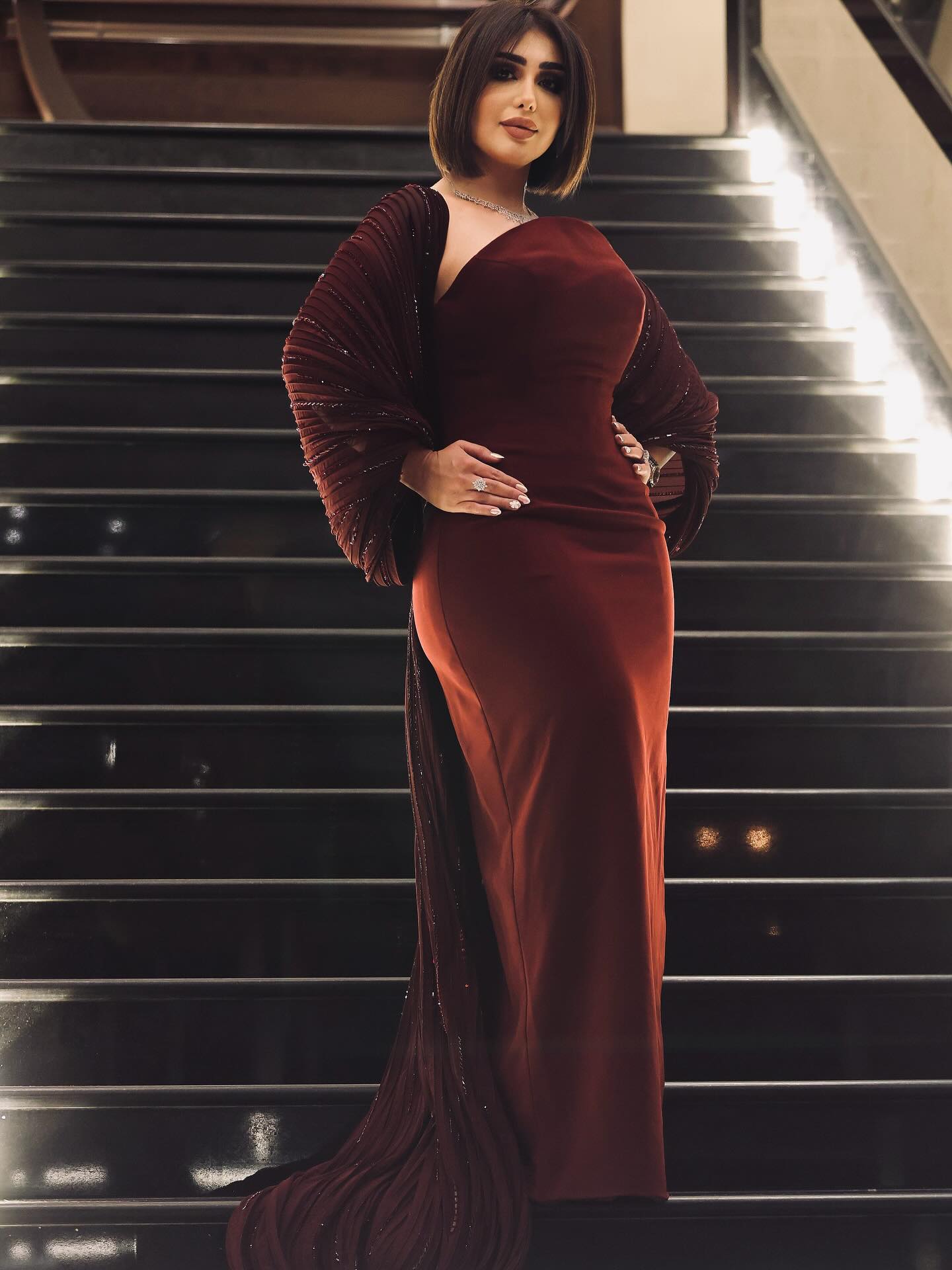 وفي ظهور آخر، خطفت الأنظار بفستان برغندي طويل بتصميم ضيق يبرز القوام، مع كتف واحد مكشوف وأكمام منسدلة لامعة، ليجمع اللوك بين الأنوثة الجريئة والرقي الهادئ، دون الخروج عن إطار الوقار.