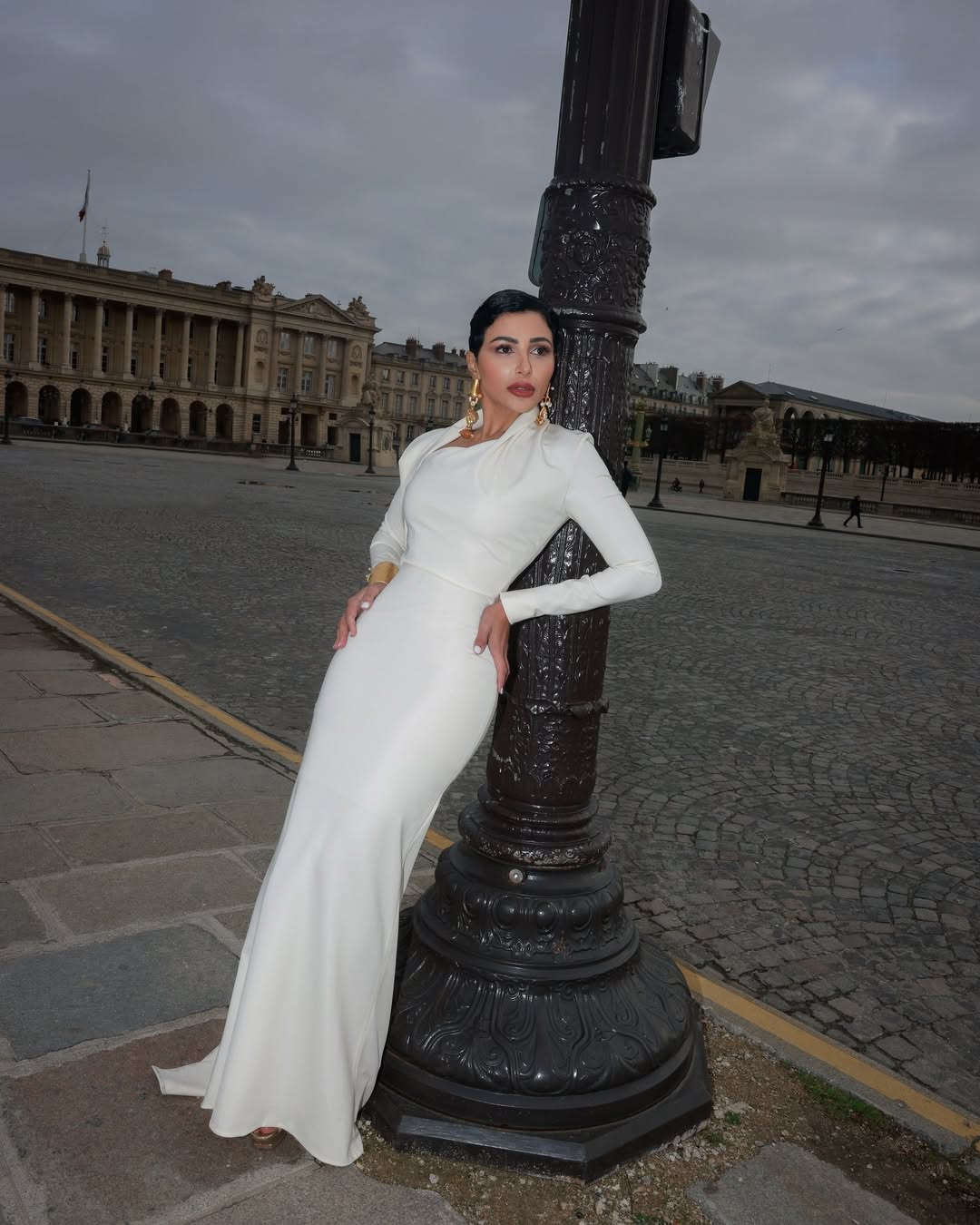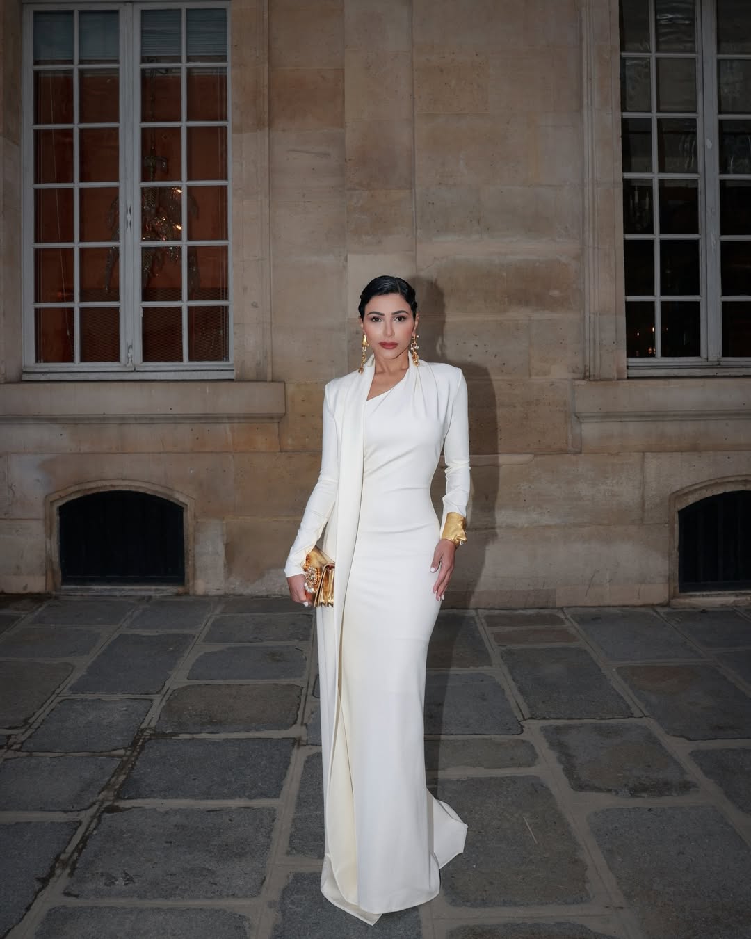 مهيرة عبدالعزيز ظهرت بإطلالة بيضاء محتشمة خلال حضورها أحد العروض الباريسية، بفستان طويل بأكمام كاملة وخصر محدد، تميّز بوشاح موصول بالكتف يلتف حول العنق وينسدل برقي. ونسّقت الإطلالة مع إكسسوارات ذهبية وحقيبة لافتة، مؤكدة أسلوبها الأنثوي الهادئ المناسب للصباح الرمضاني.